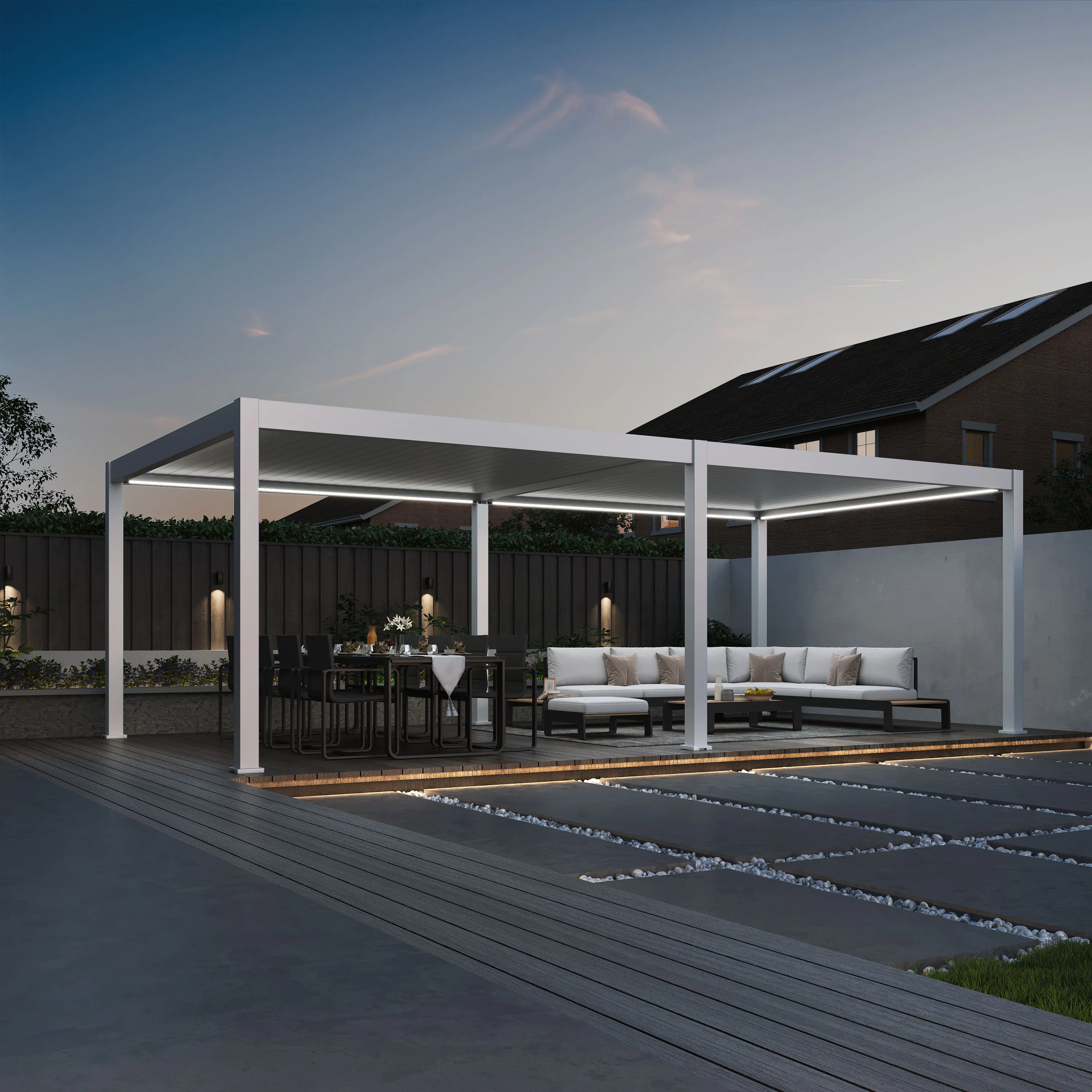 Automatyczne lamele dachowe stanowią nowoczesne i praktyczne rozwiązanie, umożliwiające precyzyjną kontrolę nad ilością światła i wentylacją pod pergolą. System pozwala na szybkie i łatwe całkowite zamknięcie lameli w celu uzyskania pełnego zacienienia, lub ich uchylenie, aby wpuścić słońce i świeże powietrze. Takie rozwiązanie gwarantuje komfortowe warunki wypoczynku o dowolnej porze dnia.