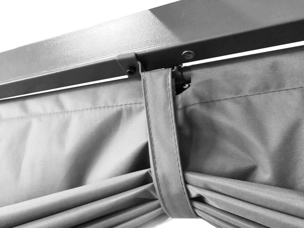 Po zsunięciu dachu materiał można łatwo zabezpieczyć dedykowanymi mocowaniami, dzięki czemu pergola prezentuje się schludnie bez względu na warunki zewnętrzne.