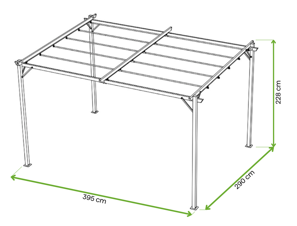 Konstrukcję pergoli tworzy stal łączona wytrzymałymi nitami, co gwarantuje jej trwałość i stabilność na długie lata. Powłoka proszkowa skutecznie chroni przed działaniem wilgoci i rdzy.