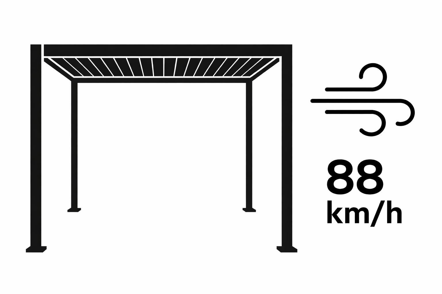 Konstrukcja została zaprojektowana tak, aby zachować pełną stabilność nawet przy silniejszych podmuchach wiatru, sięgających wysokich prędkości. Zastosowane materiały cechują się wysoką odpornością na działanie deszczu, wilgoci oraz promieniowania UV. W przypadku wystąpienia silnego wiatru zaleca się otwarcie żaluzji, co umożliwia swobodny przepływ powietrza i zmniejsza nacisk na konstrukcję.