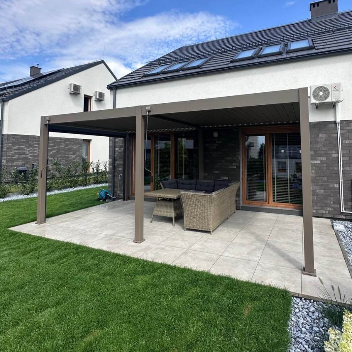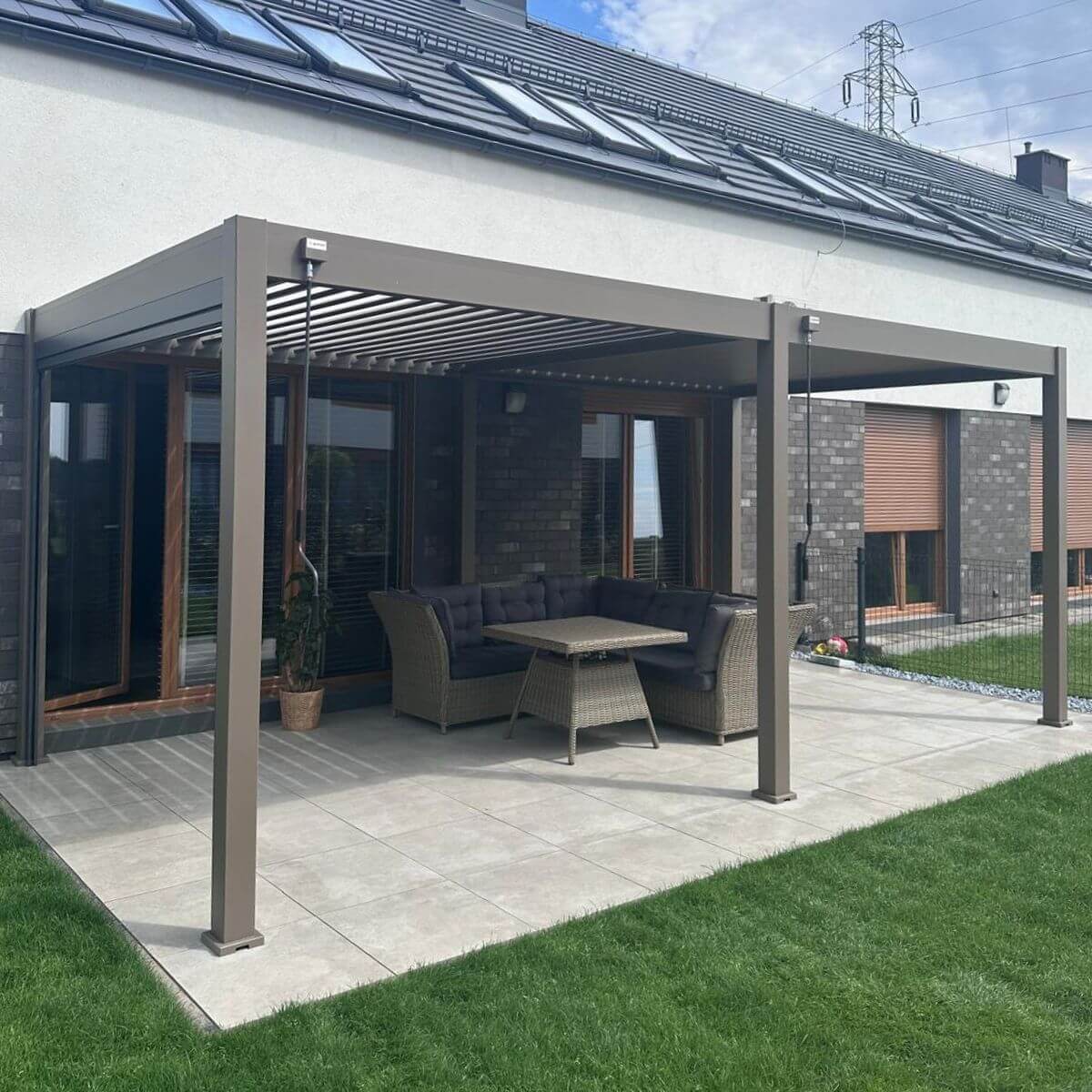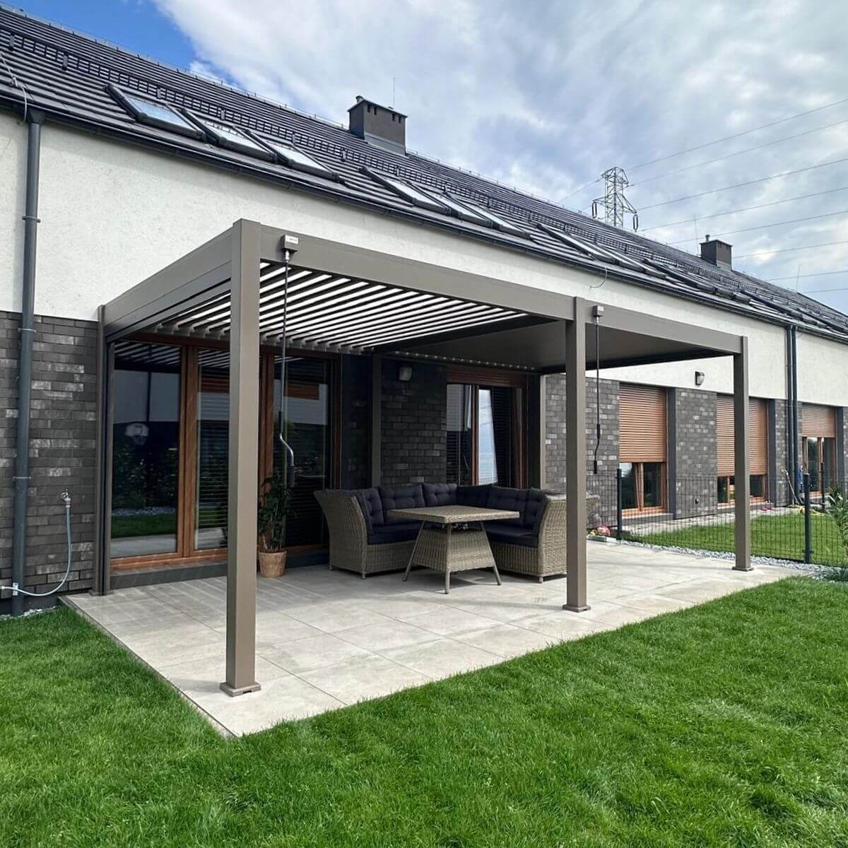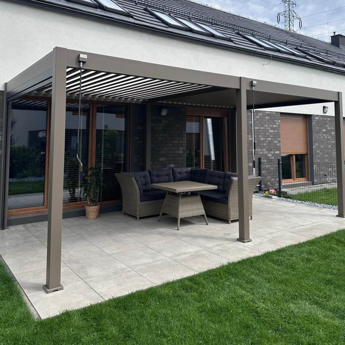 Ręczny system sterowania lamelami pozwala na precyzyjną kontrolę światła wpadającego pod pergolę. W upalne dni wystarczy je zamknąć, by stworzyć przyjemny cień, a w chłodniejsze wieczory uchylić, aby wpuścić więcej naturalnego światła. Mechanizm działa płynnie i nie wymaga dużego wysiłku, co pozwala na szybką i wygodną zmianę ustawień. Dzięki temu pergola zapewnia komfortowe warunki relaksu niezależnie od pogody.