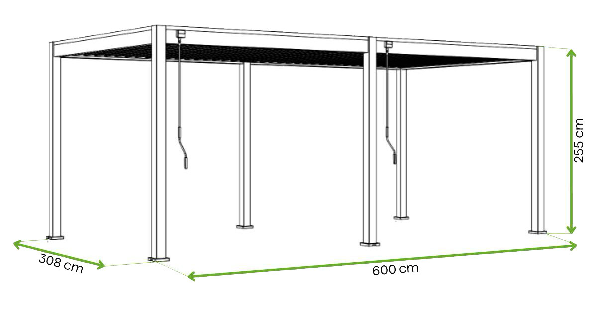 Podczas montażu pergoli należy zachować niewielki spadek – około 0,5˚, co odpowiada 1 cm na każde 1 metr długości – aby zapewnić skuteczne odprowadzanie wody deszczowej. Takie rozwiązanie zapobiega jej gromadzeniu się na dachu, co zwiększa komfort i trwałość konstrukcji. Więcej informacji znajduje się w Instrukcji.