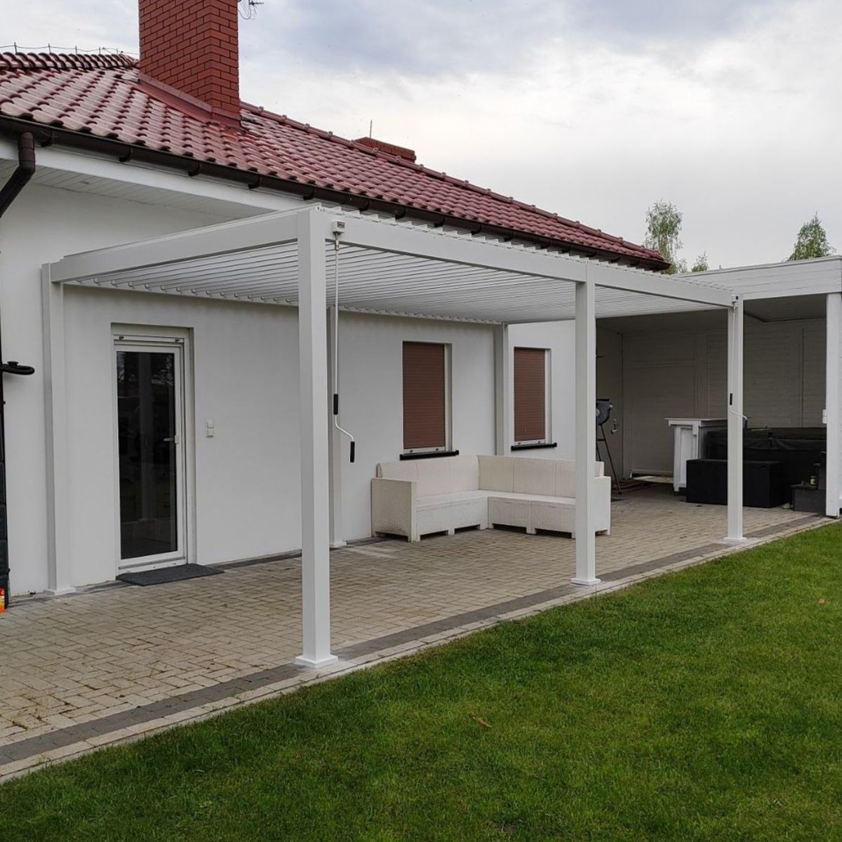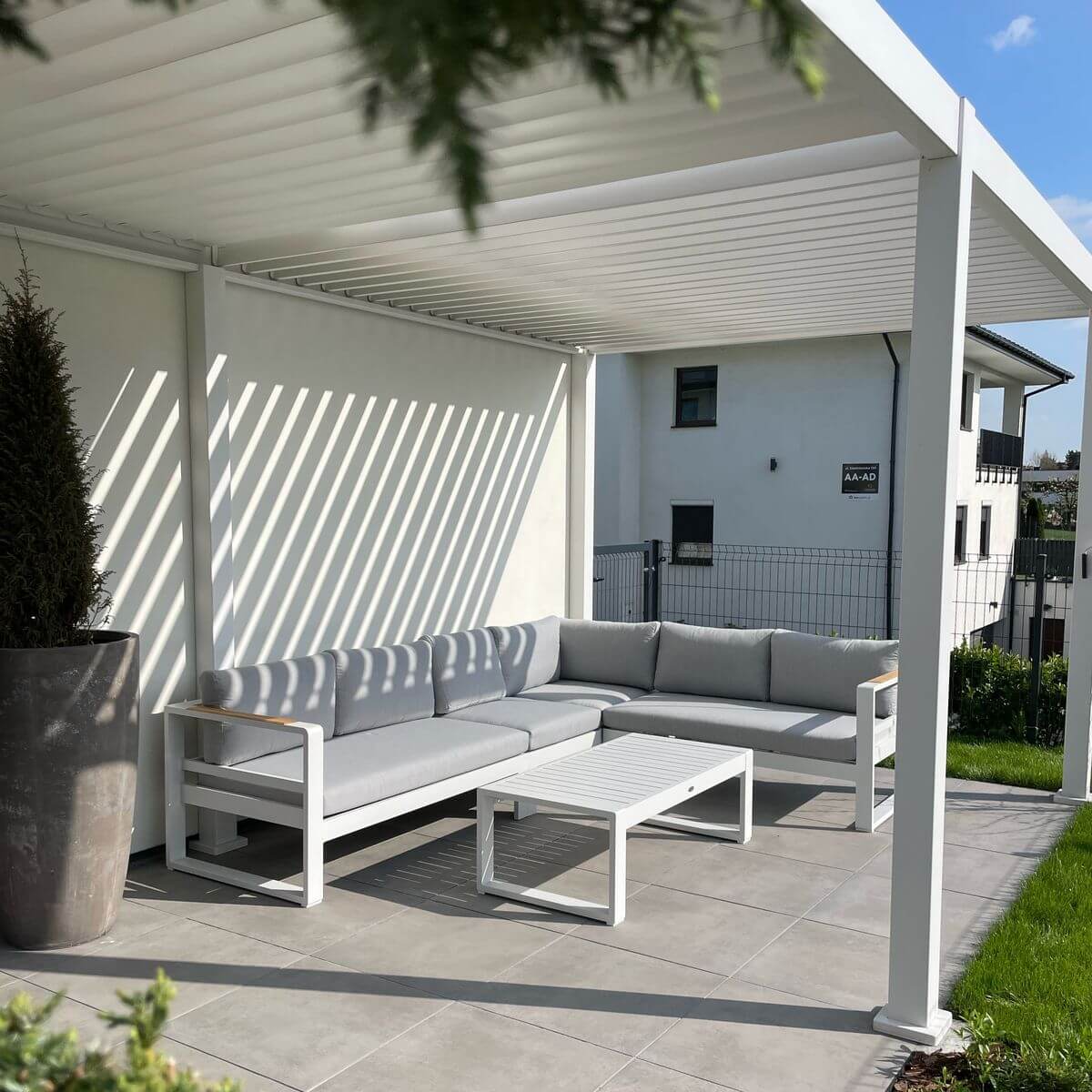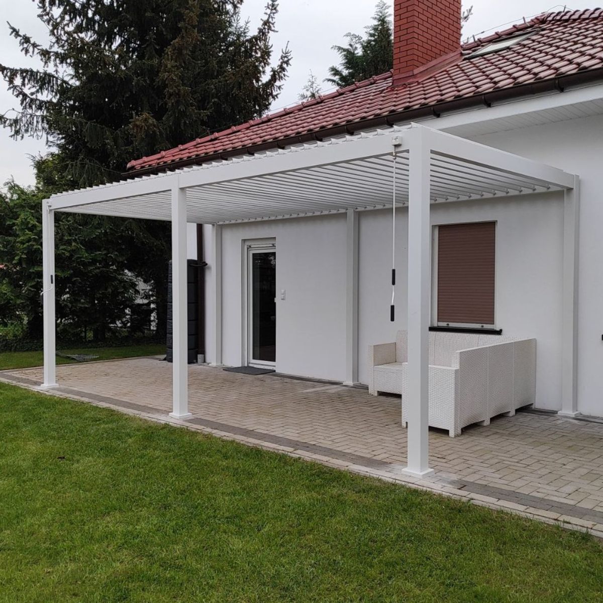 Pergola tarasowa ELEGANCE 3x6 White marki Gutroof to stylowe i funkcjonalne rozwiązanie, które świetnie sprawdzi się zarówno na tarasach, jak i w ogrodach. Wyposażona w ruchome aluminiowe lamele, pozwala na wygodną regulację ilości światła, zapewniając cień w upalne dni oraz odpowiednią wentylację w cieplejsze wieczory. Dzięki wbudowanemu systemowi rynnowemu, woda deszczowa jest skutecznie odprowadzana, co chroni przestrzeń pod pergolą przed wilgocią. Konstrukcja z aluminium malowanego proszkowo w kolorze białym gwarantuje trwałość, odporność na korozję i zachowanie estetycznego wyglądu przez długi czas.