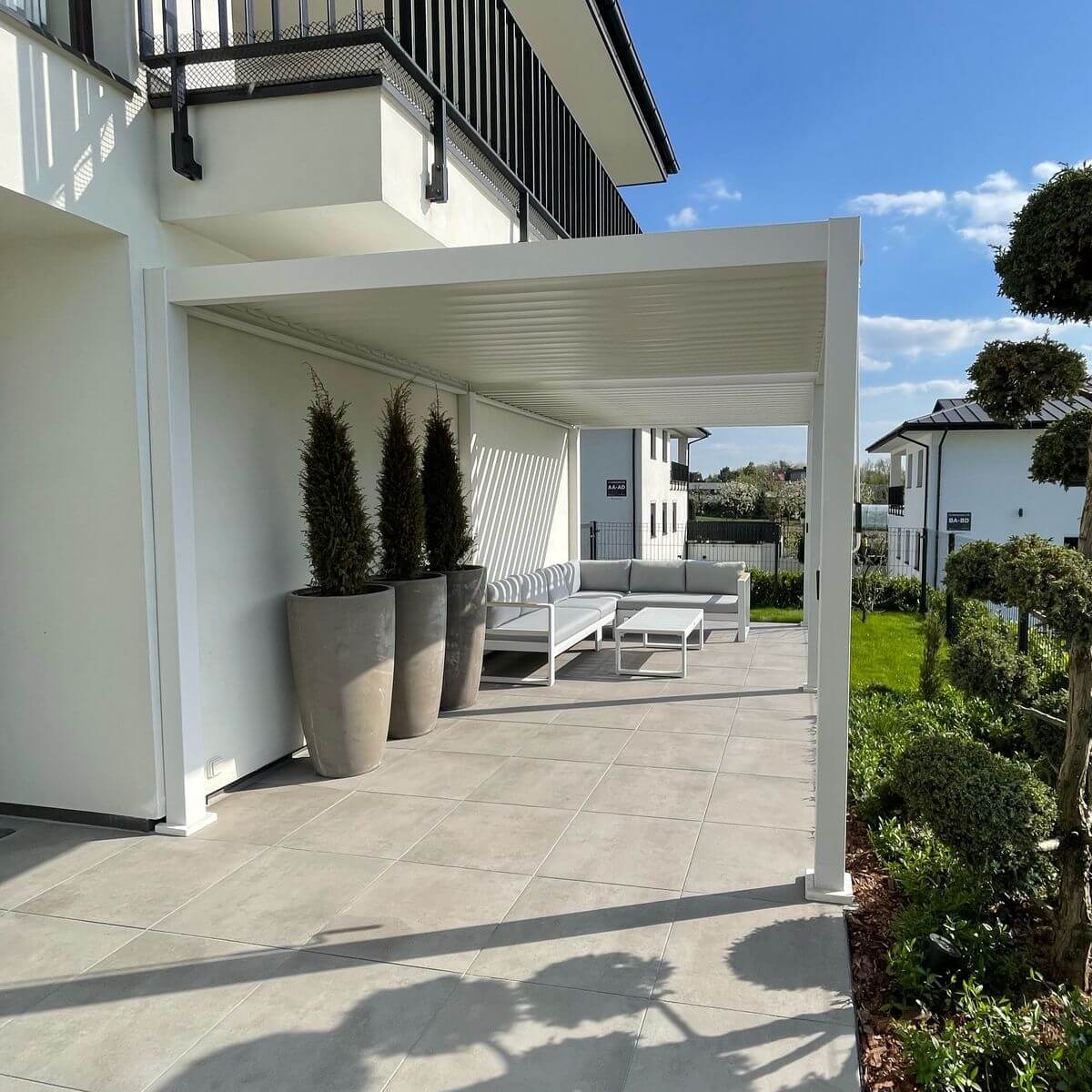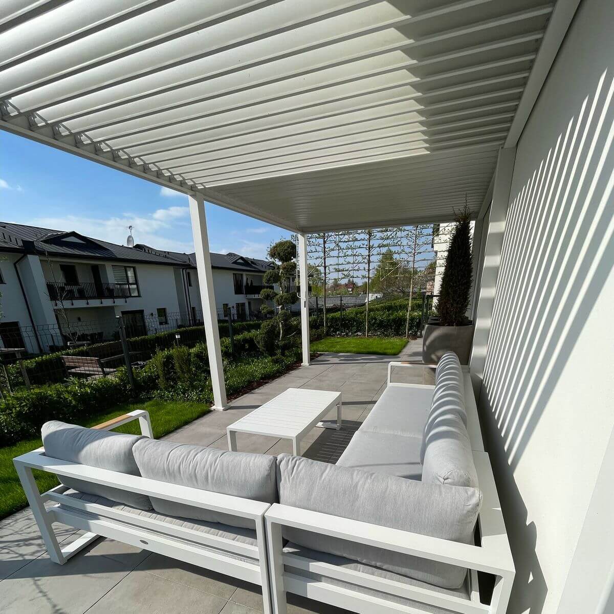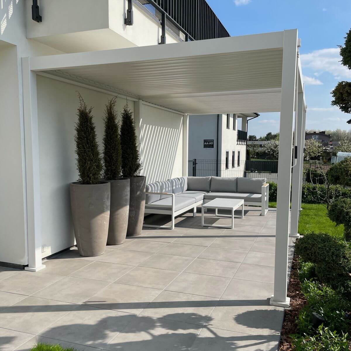 Pergola tarasowa ELEGANCE 3x6 White marki Gutroof to stylowe i funkcjonalne rozwiązanie, które świetnie sprawdzi się zarówno na tarasach, jak i w ogrodach. Wyposażona w ruchome aluminiowe lamele, pozwala na wygodną regulację ilości światła, zapewniając cień w upalne dni oraz odpowiednią wentylację w cieplejsze wieczory. Dzięki wbudowanemu systemowi rynnowemu, woda deszczowa jest skutecznie odprowadzana, co chroni przestrzeń pod pergolą przed wilgocią. Konstrukcja z aluminium malowanego proszkowo w kolorze białym gwarantuje trwałość, odporność na korozję i zachowanie estetycznego wyglądu przez długi czas.