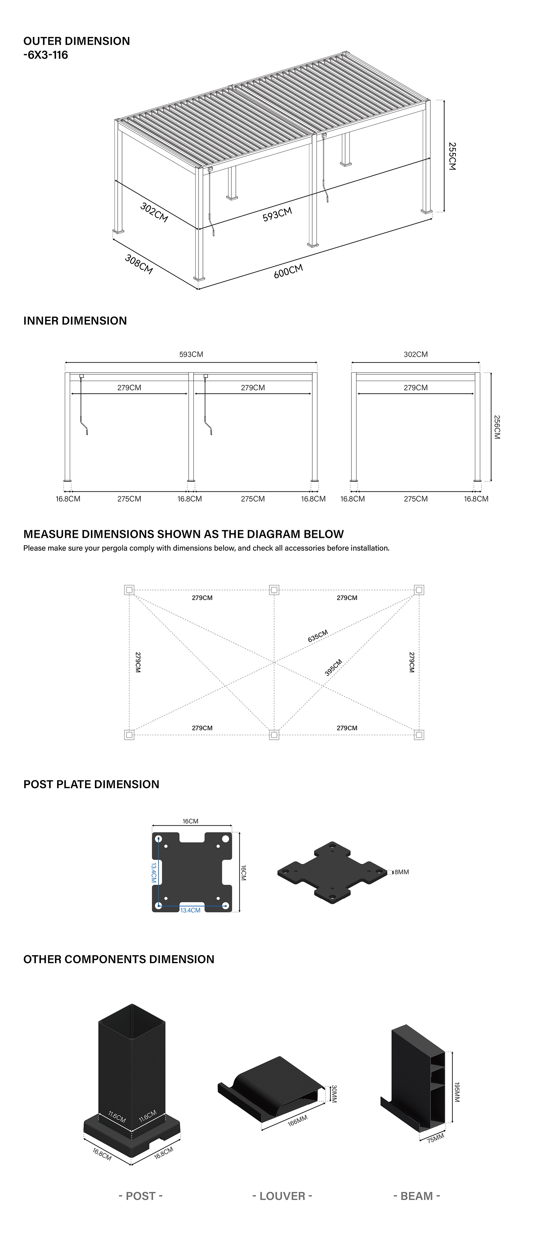 Pergola została stworzona z myślą o trwałości i niezawodności w wymagających warunkach atmosferycznych. Jej solidna konstrukcja wytrzymuje podmuchy wiatru do 100 km/h, co zapewnia stabilność nawet podczas mocnych porywów. Dach przystosowano do obciążenia śniegiem do 50 kg/m², co sprawia, że pergola sprawdzi się także zimą przy umiarkowanych opadach. Konstrukcja wykonana z aluminium malowanego proszkowo jest odporna na promieniowanie UV i korozję, dzięki czemu pergola zachowuje swój estetyczny wygląd przez długi czas. Wysoka jakość produktu została potwierdzona certyfikatem Intertek.