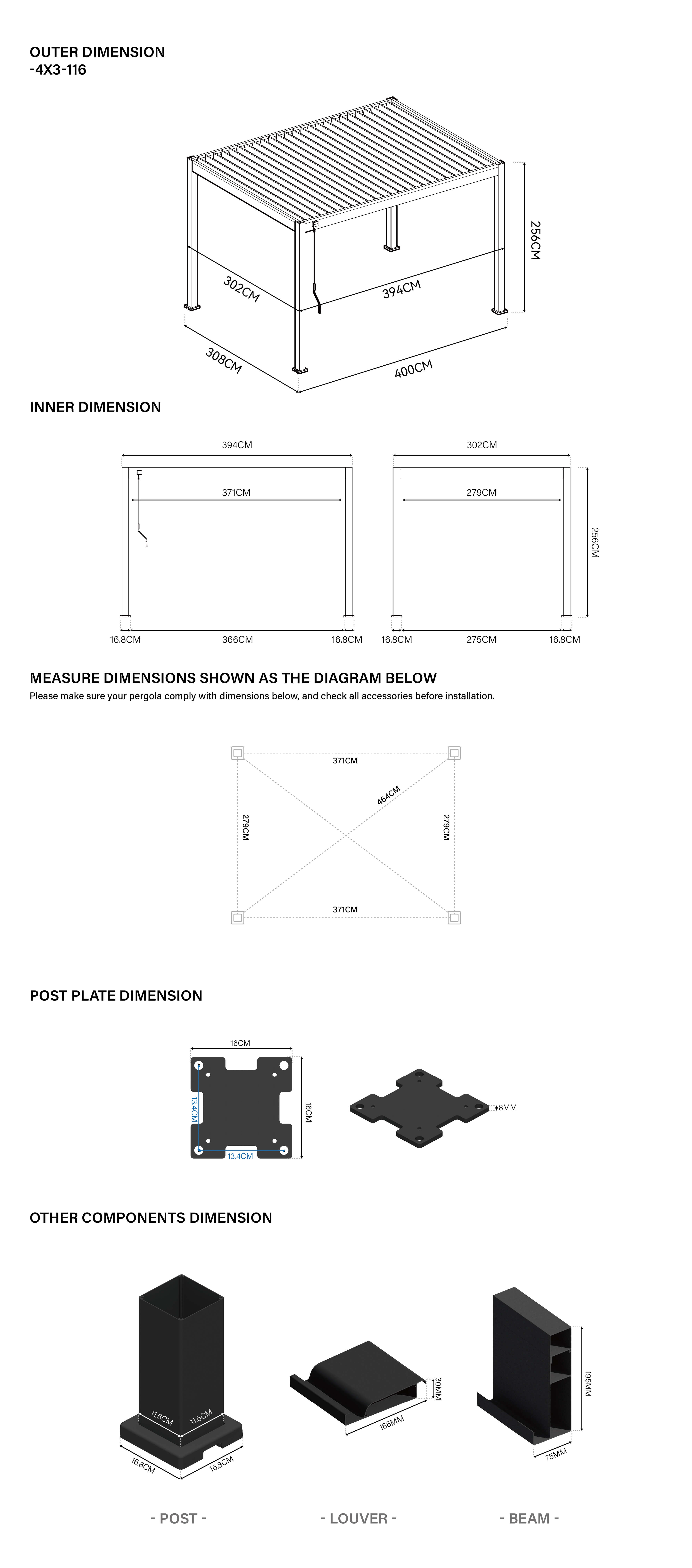 Instalacja pergoli jest intuicyjna i nie wymaga specjalnych umiejętności. Z uwagi na wielkość konstrukcji najlepiej przeprowadzać montaż przy udziale 2-3 osób, co ułatwi ustawienie i stabilizację elementów. W zestawie znajdują się wszystkie niezbędne elementy montażowe, co sprawia, że proces instalacji jest szybki i wygodny.