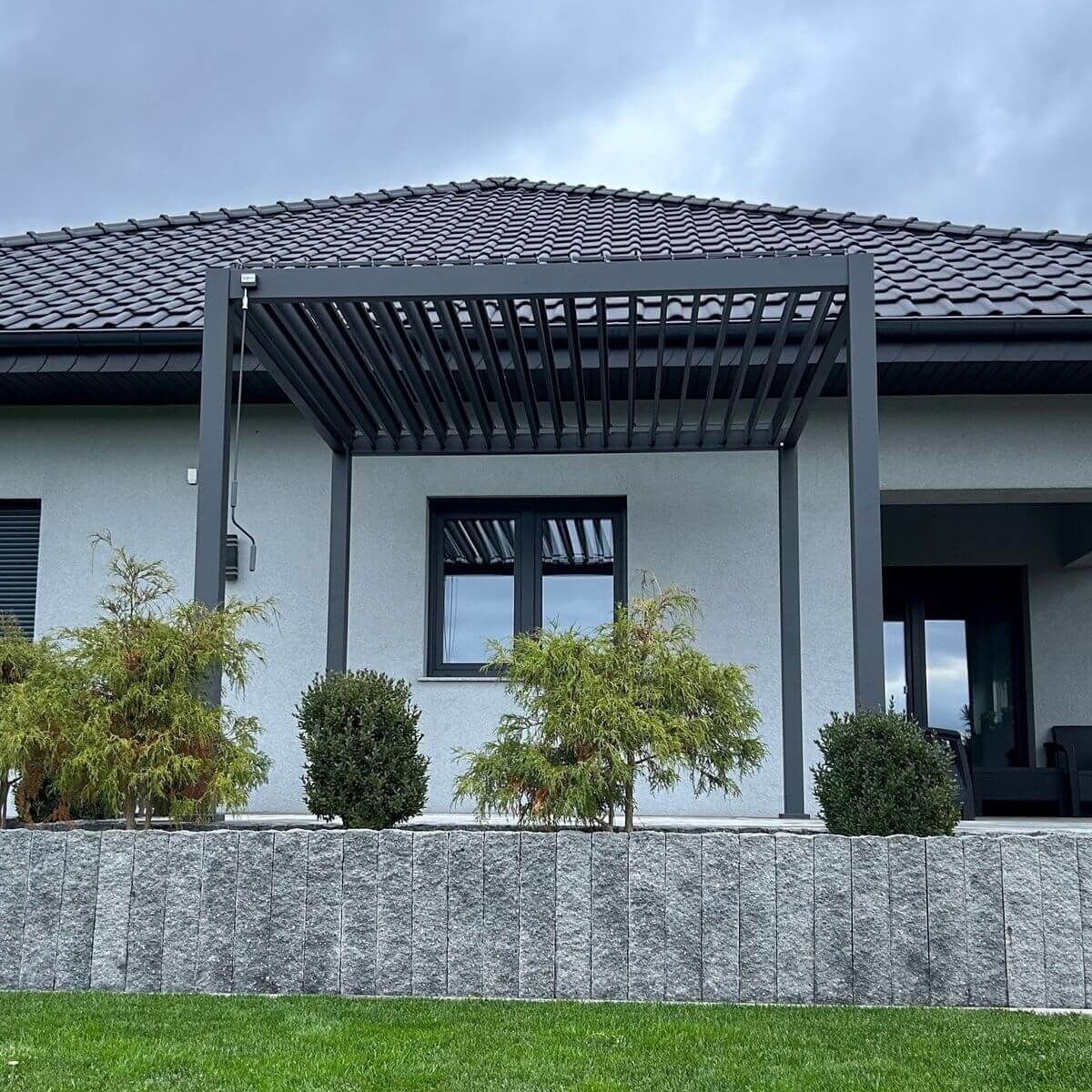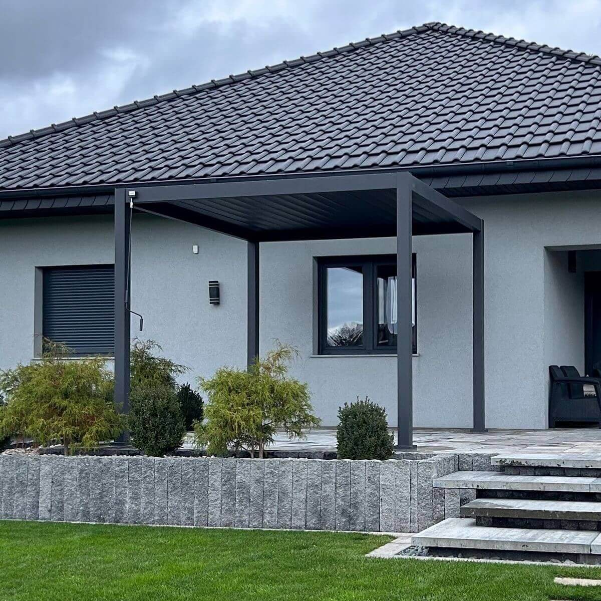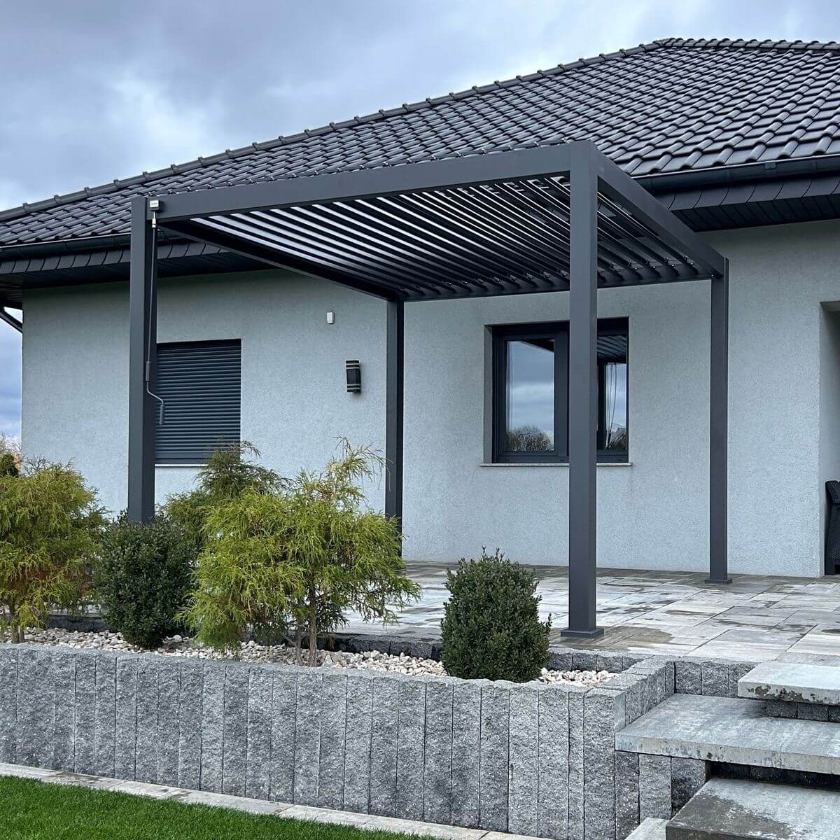 Pergola ogrodowa na taras Premium 3x3 Anthracite marki Gutroof to eleganckie i funkcjonalne zadaszenie, idealne do stworzenia przytulnej przestrzeni na świeżym powietrzu. Wykonana z wysokiej jakości aluminium, zapewnia trwałość i odporność na warunki atmosferyczne. Ruchome stalowe lamele umożliwiają regulację nasłonecznienia, dostosowując poziom cienia do indywidualnych potrzeb. W odróżnieniu od modelu Classic, pergola Premium oferuje możliwość doboru dodatkowych akcesoriów, takich jak drzwi przesuwne, rolety oraz panele żaluzjowe, co pozwala na pełne dostosowanie przestrzeni do własnych preferencji.