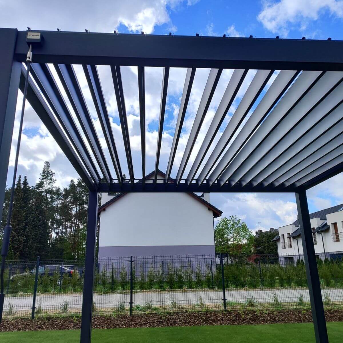 Lamele dachowe pergoli regulowane w zakresie od 0° do 90°, umożliwiają płynną zmianę kąta nachylenia. Pozycja 0° zapewnia całkowitą ochronę przed słońcem i deszczem, tworząc szczelne zadaszenie, natomiast ustawienie 90° pozwala na pełne otwarcie dachu, maksymalizując wentylację i dostęp światła.