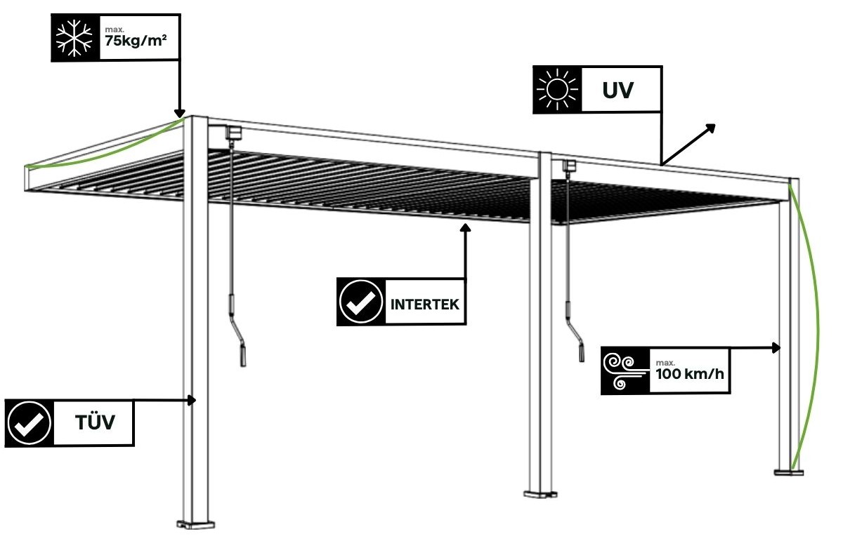 Pergola Gutroof DELUXE to synonim trwałości i bezpieczeństwa. Aluminiowa konstrukcja, odporna na korozję, promieniowanie UV oraz zmienne warunki pogodowe, gwarantuje niezawodność przez lata. Jej wytrzymałość jest imponująca – znosi podmuchy wiatru do 100 km/h i obciążenie śniegiem do 75 kg/m². Najwyższa jakość i bezpieczeństwo użytkowania są oficjalnie potwierdzone prestiżowymi certyfikatami TÜV i Intertek.