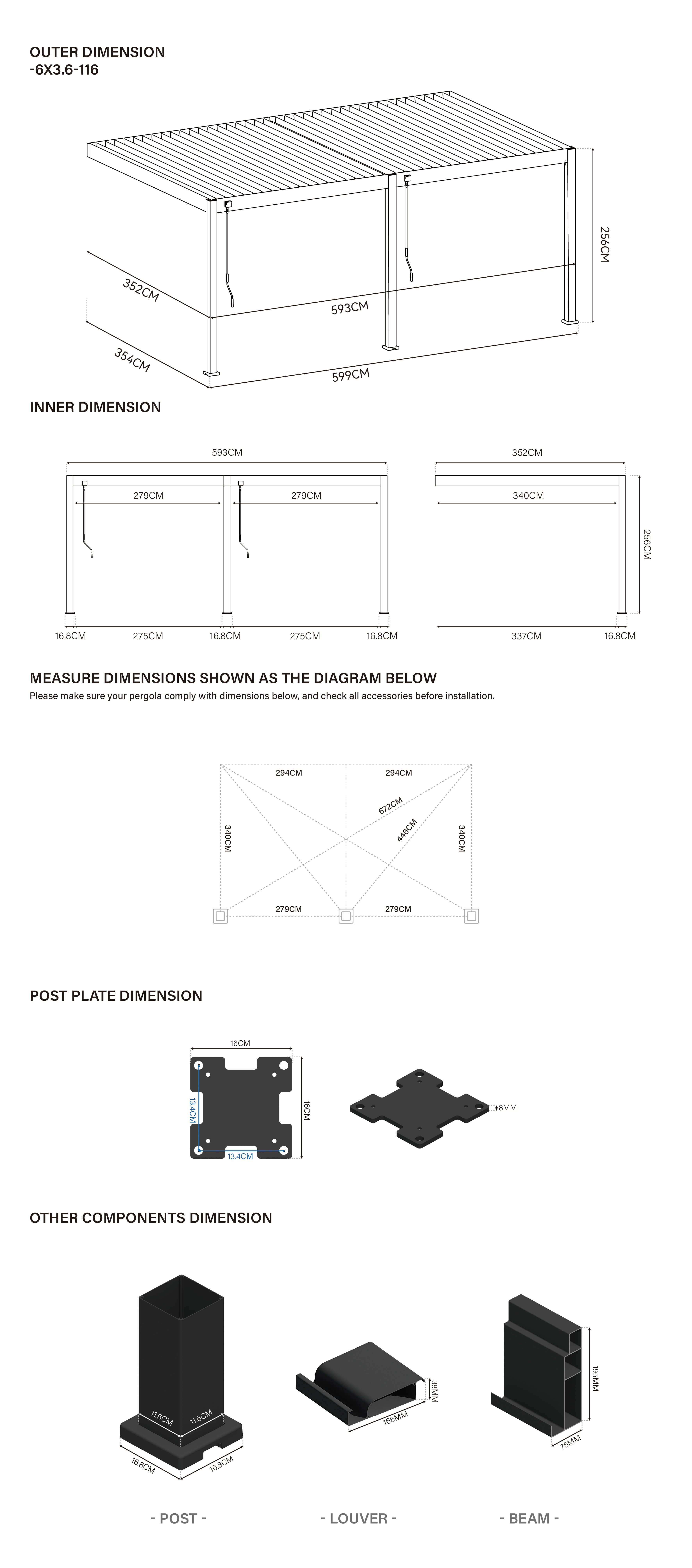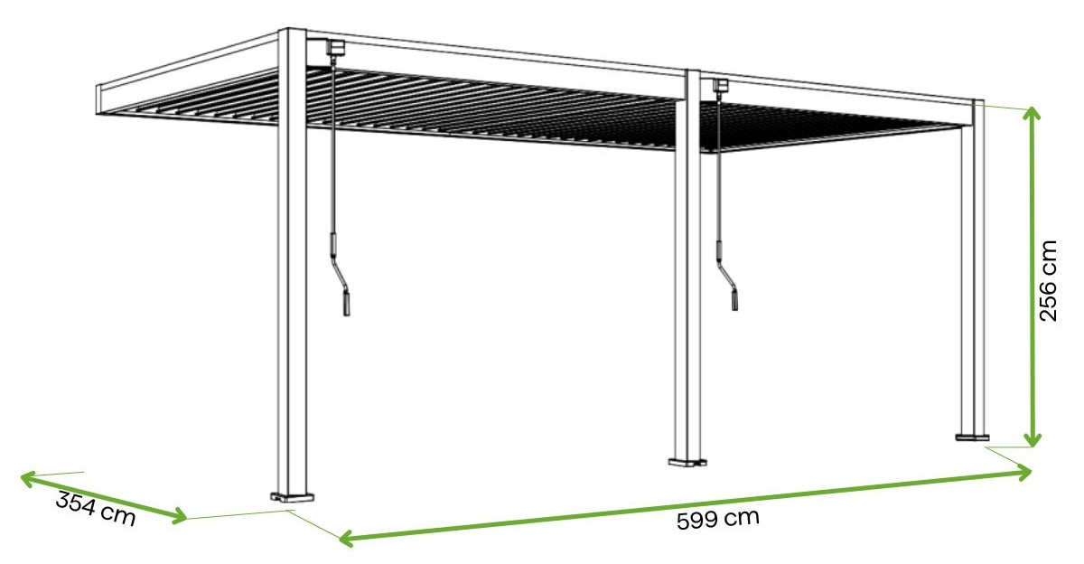 Wymiary pergoli: 354 × 599 × 256 cm