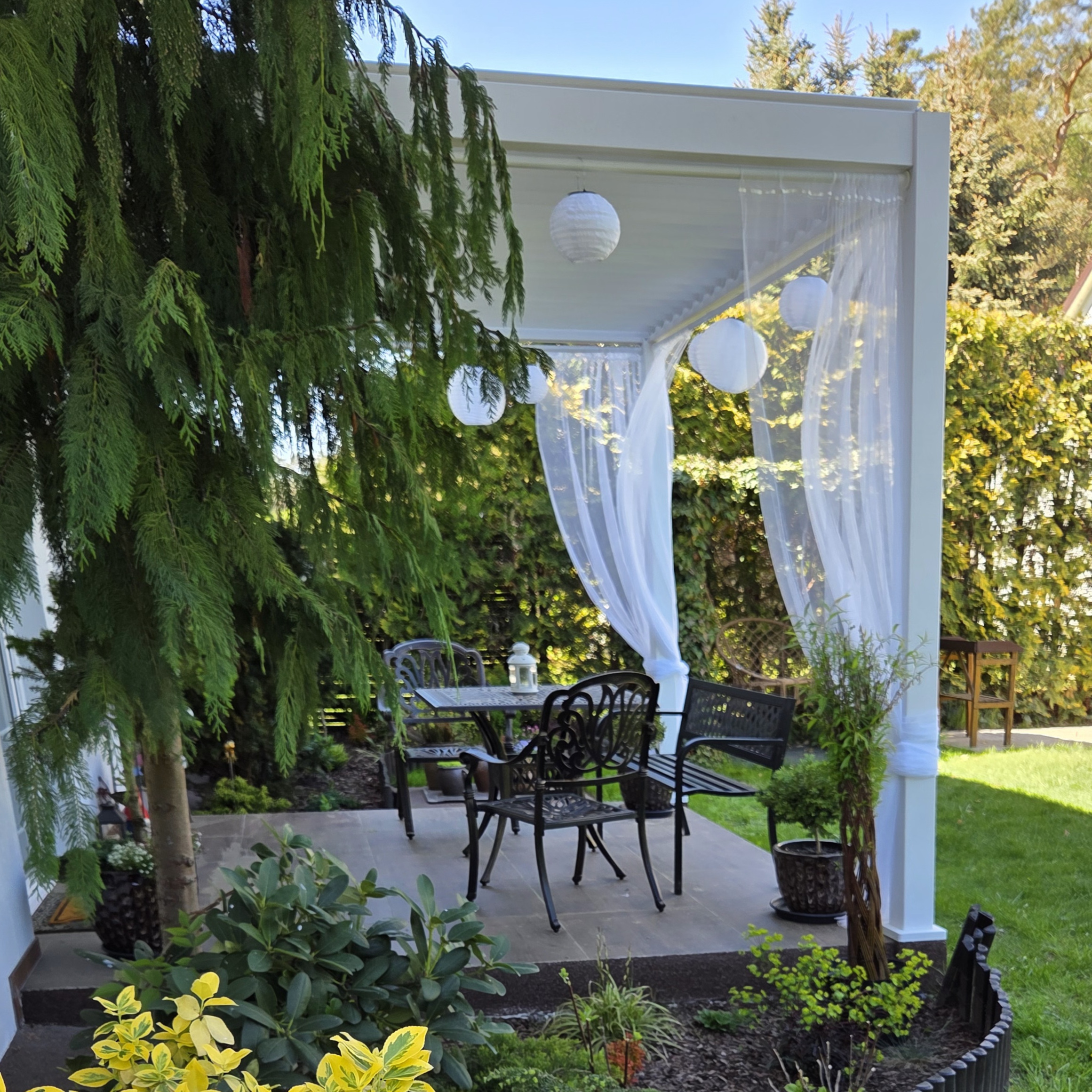 Potrzebujesz inspiracji? Oto kilka przykładowych realizacji pergoli tarasowych do ogrodu, ściennych 3x3 Premium Wall White - Gutroof u naszych klientów. Nie czekaj! Tak może wyglądać Twój ogród!