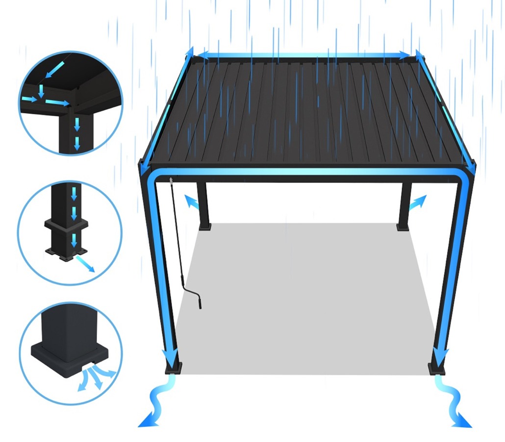 Innowacyjny system dwuwarstwowych lameli w dachu pergoli zapewnia skuteczną ochronę przed słońcem. Zachodzące na siebie lamele tworzą powierzchnię, dzięki której można korzystać z przestrzeni wypoczynkowej niezależnie od warunków pogodowych.