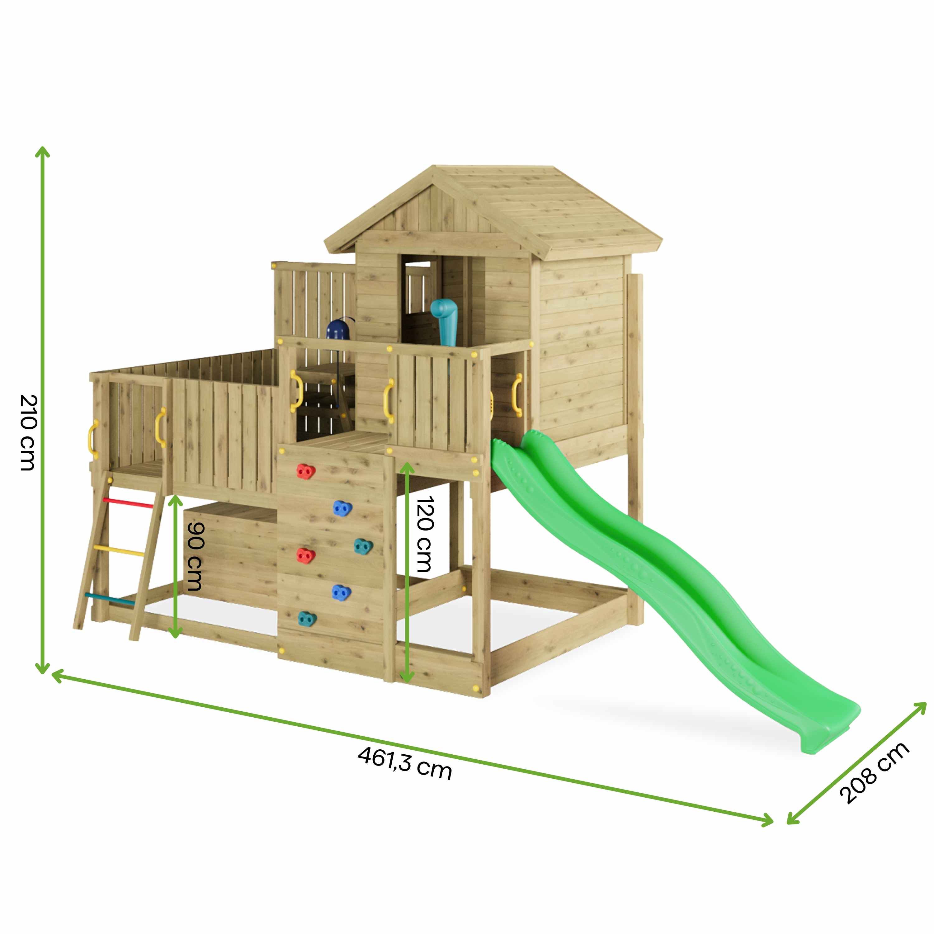 Chcesz stworzyć swoim dzieciom własny kąt, który połączy radość z ruchu z domową przytulnością? Plac zabaw dla dzieci Sweet House marki Fungoo to wyjątkowa konstrukcja z urokliwym domkiem, która dzięki naturalnemu wykończeniu drewna idealnie komponuje się z estetyką każdej przydomowej przestrzeni. Zestaw oferuje dwie przestronne platformy rekreacyjne na różnych wysokościach, połączone z tarasem, co zapewnia dzieciom mnóstwo miejsca do swobodnej zabawy. Solidna konstrukcja z drewna sosnowego, wyposażona w ściankę wspinaczkową oraz funkcjonalne stoliki do zabawy, tworzy bezpieczne miejsce do aktywności dla 10 użytkowników jednocześnie.