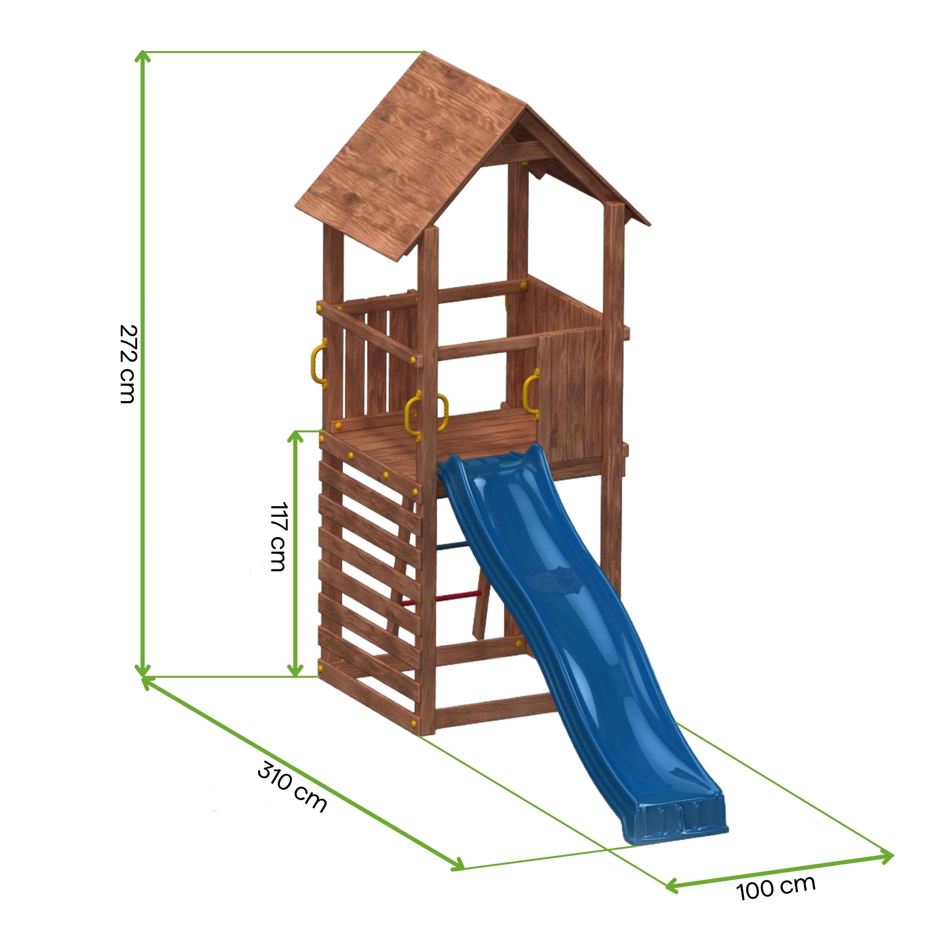 Elementy aktywne: zjeżdżalnia 2,2 m, drabinka z metalowymi szczeblami