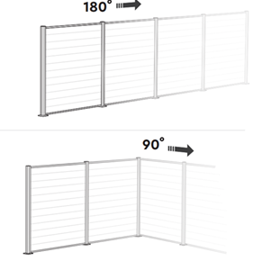 Płot można montować pod kątem 90°, co świetnie sprawdzi się przy tworzeniu narożników ogrodzenia. Ustawienie pod kątem 180° pozwala na estetyczne i stabilne poprowadzenie ogrodzenia w linii prostej.