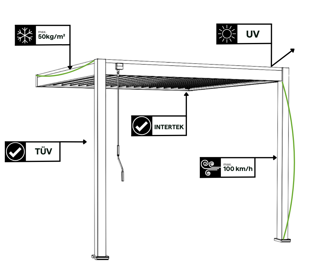 Pergola została zaprojektowana z myślą o wytrzymałości i niezawodności w każdych warunkach pogodowych. Jej solidna konstrukcja jest odporna na wiatr o prędkości do 100 km/h oraz obciążenie śniegiem do 50 kg/m², co gwarantuje stabilność przez cały rok. Dodatkowym atutem są certyfikaty TÜV oraz Intertek, potwierdzające wysoką jakość wykonania i zgodność z rygorystycznymi normami bezpieczeństwa. To trwałe i funkcjonalne rozwiązanie, które zapewni Ci spokój i komfort niezależnie od pogody.