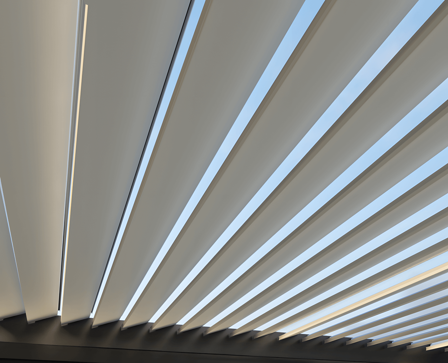 Pergola została wyposażona w aluminiowe lamele dachowe, które można obracać pod kątem 135°, umożliwiając precyzyjne sterowanie ilością światła wpadającego pod zadaszenie. W słoneczne dni zapewniają one przyjemny cień, a w chłodniejsze wieczory wystarczy delikatnie uchylić lamele, by poprawić cyrkulację powietrza. Intuicyjny mechanizm obsługi działa płynnie i bez wysiłku, co pozwala na szybkie dostosowanie ustawień do zmieniających się warunków pogodowych, zapewniając pełen komfort użytkowania.