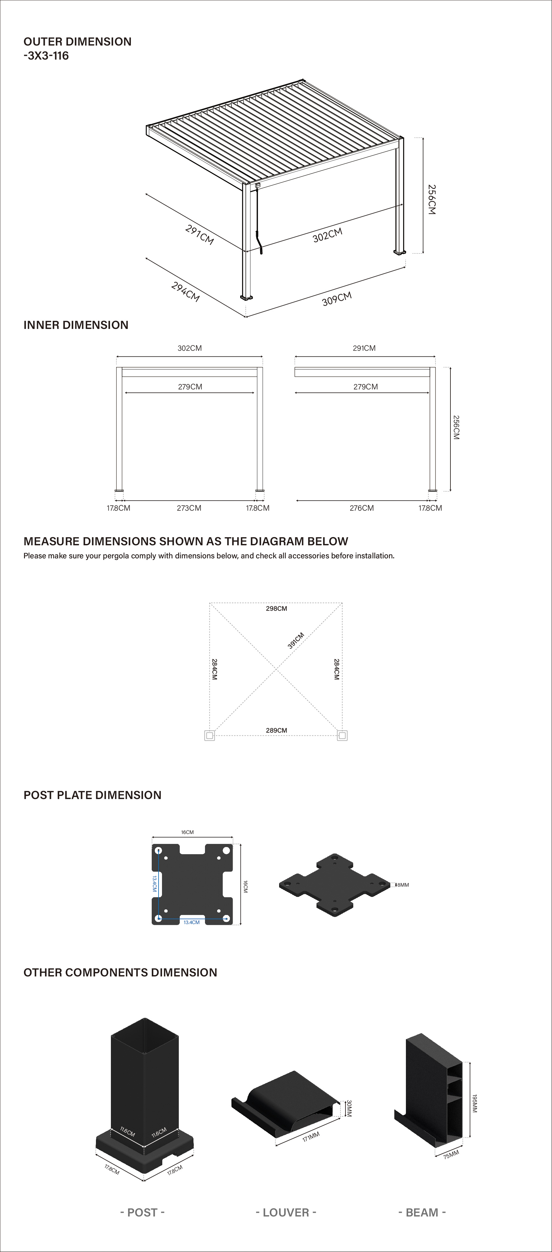 Montaż pergoli jest prosty i nie wymaga specjalistycznych umiejętności, jednak ze względu na rozmiar konstrukcji zaleca się przeprowadzenie go z pomocą 2-3 osób. W zestawie znajdują się wszystkie niezbędne elementy montażowe, co ułatwia instalację. Dla zapewnienia stabilności pergolę najlepiej montować na stabilnym podłożu, np. płycie betonowej lub betonowych podkładach o wymiarach 25 × 25 cm i grubości co najmniej 10 cm. Konstrukcję należy solidnie przymocować za pomocą śrub rozporowych. Przy montażu w pobliżu budynku warto sprawdzić położenie rynien, aby uniknąć problemów z odpływem wody.