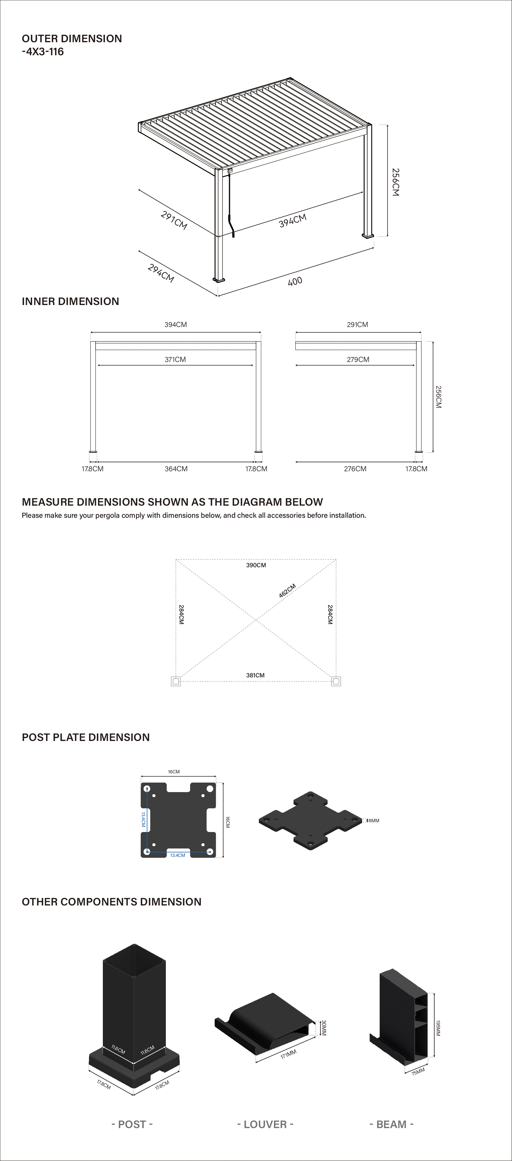 Montaż pergoli jest prosty i nie wymaga specjalistycznych umiejętności, jednak ze względu na rozmiar konstrukcji zaleca się przeprowadzenie go z pomocą 2-3 osób. W zestawie znajdują się wszystkie niezbędne elementy montażowe, co ułatwia instalację. Dla zapewnienia stabilności pergolę najlepiej montować na stabilnym podłożu, np. płycie betonowej lub betonowych podkładach o wymiarach 25 × 25 cm i grubości co najmniej 10 cm. Konstrukcję należy solidnie przymocować za pomocą śrub rozporowych. Przy montażu w pobliżu budynku warto sprawdzić położenie rynien, aby uniknąć problemów z odpływem wody.