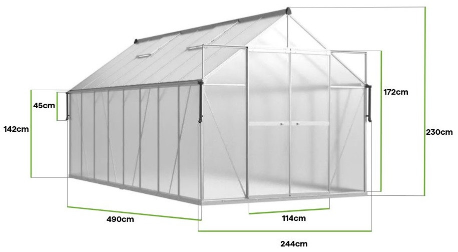 Praktyczne drzwi o dużej wysokości – przesuwne drzwi o wysokości 172 cm umożliwiają swobodny dostęp i wygodną pracę w szklarni.