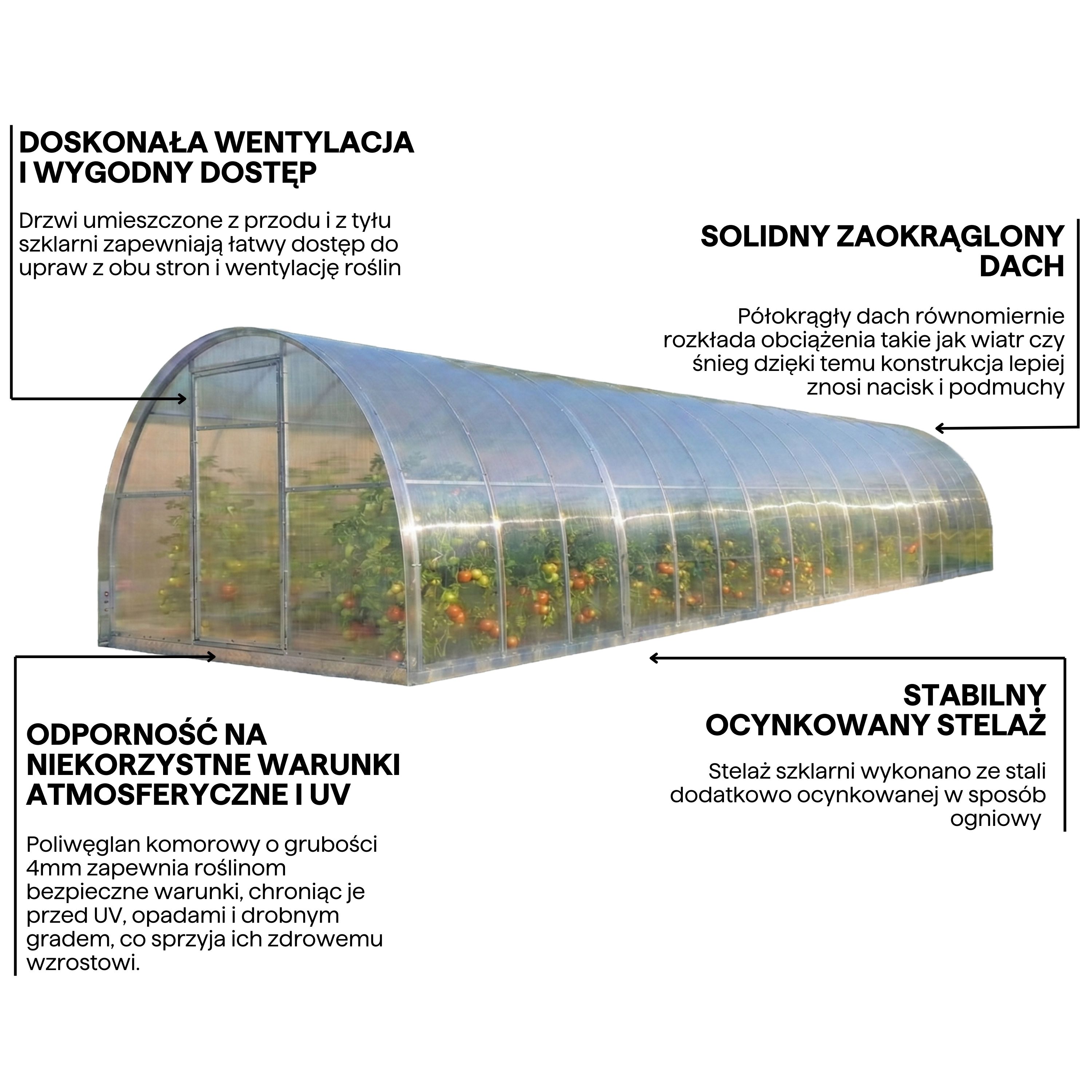 Dzięki zwiększonej liczbie i gęstszemu rozmieszczeniu łuków (co 67 cm), wzmocniona konstrukcja szklarni osiąga wyjątkową odporność na obciążenia wynikające z zalegania śniegu.