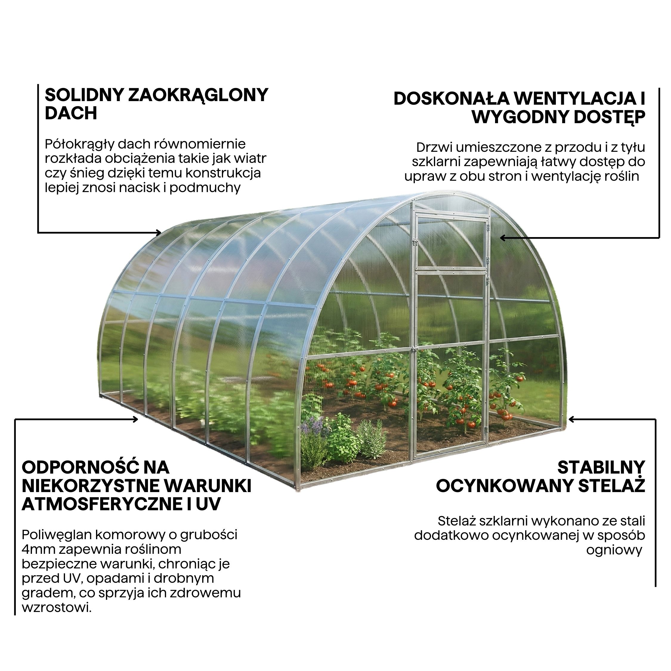Stelaż szklarni jest wykonany ze stali nierdzewnej ocynkowanej w sposób ogniowy, dzięki czemu konstrukcja pozostaje odporna na korozję i stabilna przez długie lata.