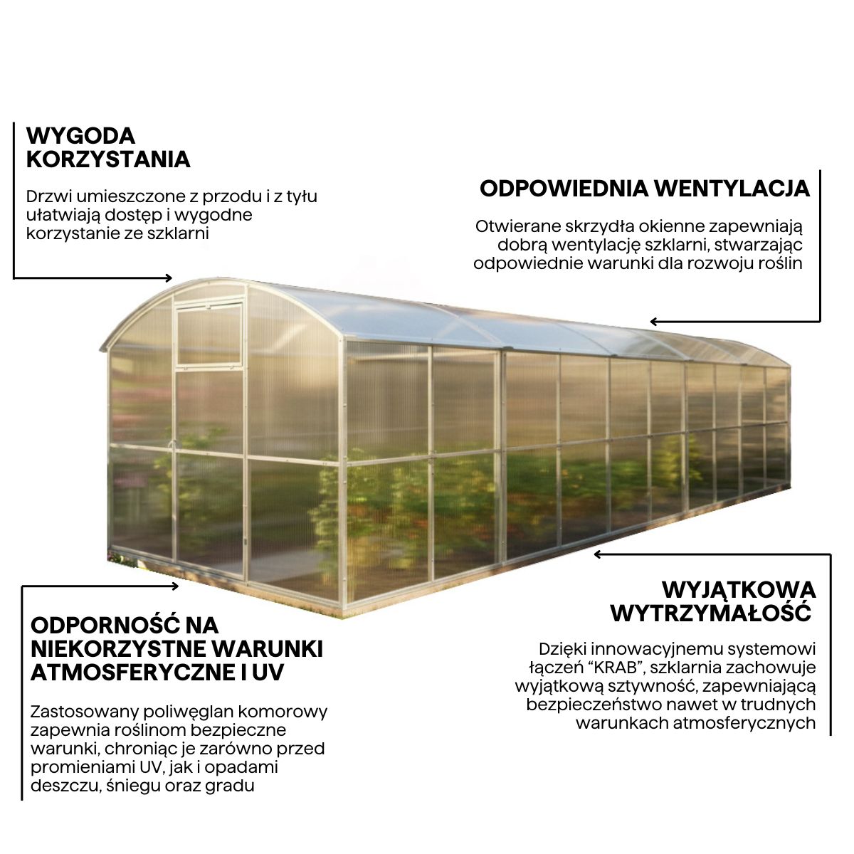 Szklarnia ogrodowa poliwęglanowa 6 mm MUSERA 3 x 10 m od Cultivo zapewnia obfite zbiory i wyraźnie wydłużony okres wegetacji. Jest to idealny wybór dla każdego, kto poszukuje profesjonalnej i wytrzymałej konstrukcji pod uprawę! Szkielet zbudowany jest z mocnego, ocynkowanego profilu stalowego 40x20 mm i wykorzystuje nowatorskie łączenie "krabowe", oferując tym samym doskonałą stabilność oraz wytrzymałość na obciążenie śniegiem. Duża szklarnia prostościenna wyposażona jest w dwoje drzwi oraz dwa skrzydła okienne, co umożliwia sprawne wietrzenie i swobodny dostęp do jej wnętrza. Zapewnij najlepsze środowisko dla rozwoju roślin!