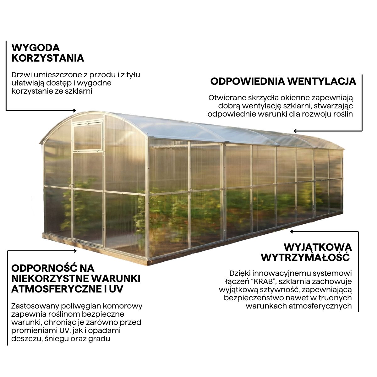Konstrukcja szklarni z prostymi ścianami, które mają 1,65 m wysokości, umożliwia maksymalne wykorzystanie całej dostępnej powierzchni pod hodowlę. Ponadto, szklarnia gwarantuje komfort podczas pac pielęgnacyjnych, pozwalając na wykonywanie czynności w pozycji wyprostowanej i eliminując potrzebę częstego pochylania się.