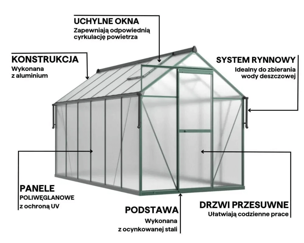 Szklarnia ogrodowa z poliwęglanu Slide-In 183x361cm Dark Green marki Cultivo to idealne połączenie estetyki, funkcjonalności i nowoczesnych rozwiązań. Jej ciemnozielona konstrukcja harmonijnie komponuje się z naturalnym otoczeniem, nadając ogrodowi przytulny charakter. Przestronna długość 361 cm oferuje wyjątkową ilość miejsca do uprawy warzyw, owoców, kwiatów czy ziół, czyniąc ją idealnym wyborem zarówno dla początkujących, jak i zaawansowanych ogrodników. Panele poliwęglanowe o grubości 4 mm, wzbogacone ochroną UV, zapewniają roślinom optymalne warunki wzrostu, skutecznie rozpraszając światło słoneczne i chroniąc przed jego nadmiernym wpływem. Konstrukcja opiera się na trwałej aluminiowej ramie oraz ocynkowanej stalowej podstawie, gwarantując odporność na zmienne warunki atmosferyczne. Dzięki innowacyjnemu systemowi Slide-In montaż jest prosty i szybki, a stabilność szklarni na najwyższym poziomie. Dodatkowym atutem jest praktyczna rynna deszczowa, zawieszona na wysokości 92 cm, o długości 45 cm. Pozwala ona zbierać deszczówkę, umożliwiając ekologiczne i oszczędne nawadnianie upraw. Dwa okna wentylacyjne i przesuwne drzwi zapewniają doskonałą wentylację oraz łatwy dostęp do wnętrza. Szklarnia Slide-In Dark Green to rozwiązanie, które wprowadzi Twój ogród na nowy poziom funkcjonalności.