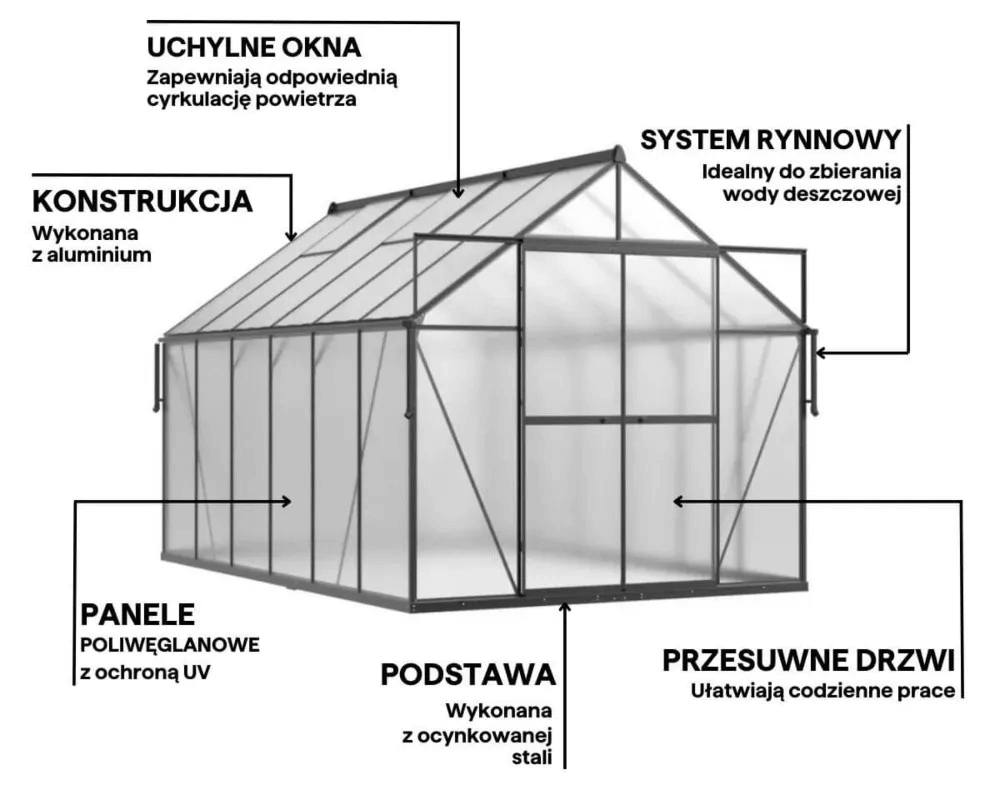 Solidnie wzmocniony próg zwiększa nośność konstrukcji, zapewniając długotrwałą trwałość szklarni nawet przy częstym wchodzeniu