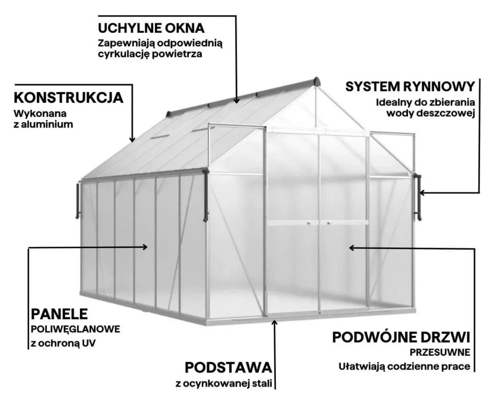 Głębokie i wytrzymałe profile aluminiowe wzmacniają konstrukcję szklarni, zwiększając jej odporność na odkształcenia, ciężar zalegającego śniegu oraz podmuchy silnego wiatru. Dzięki temu konstrukcja jest nie tylko bardziej trwała, ale też zapewnia długotrwałe i bezproblemowe użytkowanie nawet w trudnych warunkach pogodowych.