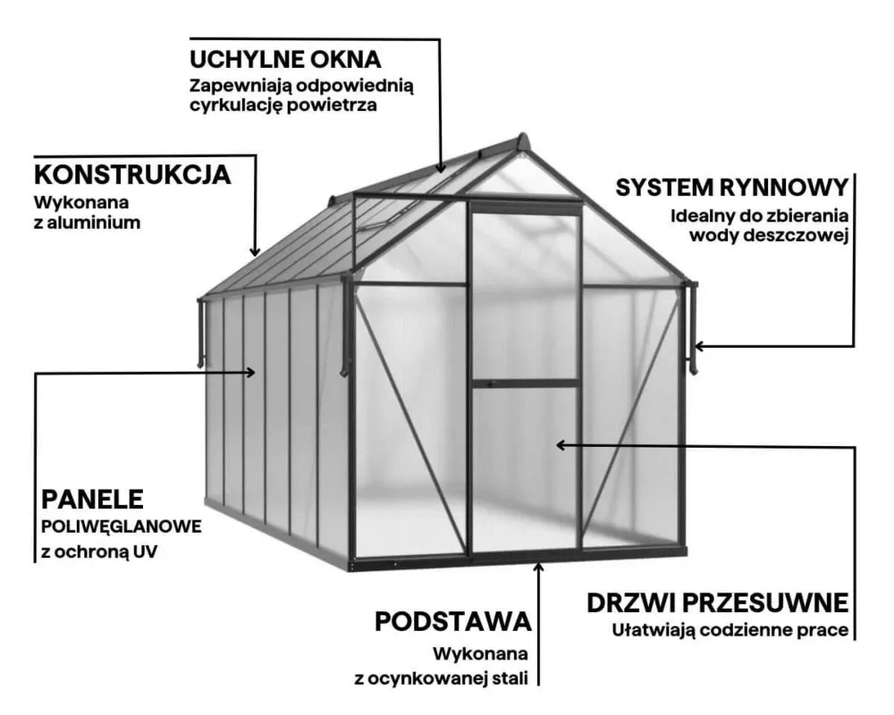 Antykorozyjne aluminium jest gwarancją odporności na deszcz, wiatr i zmienne warunki atmosferyczne, co wydłuża żywotność szklarni.