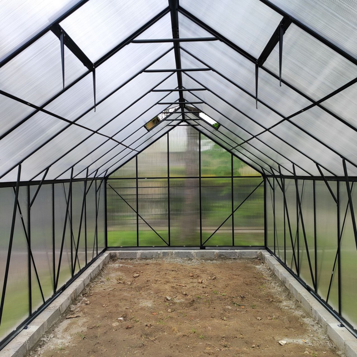 Zaawansowany system Slide-In umożliwia montaż paneli poliwęglanowych bez użycia metalowych spinek, wsuwając je bezpośrednio w ramy konstrukcji, co zapewnia wysoką stabilność i trwałość szklarni. Dzięki temu nawet początkujący mogą szybko złożyć szklarnie. Panele są solidnie osadzone w ramie, co zwiększa odporność na wiatr i trudne warunki atmosferyczne, a brak luźnych elementów ogranicza ryzyko uszkodzeń w dłuższym czasie. Dokładny sposób działania systemu pokazano na filmie. Należy pamiętać, że szklarnia musi być ustawiona co najmniej 1,5 m od budynku, aby zapewnić prawidłową instalację i wentylację.