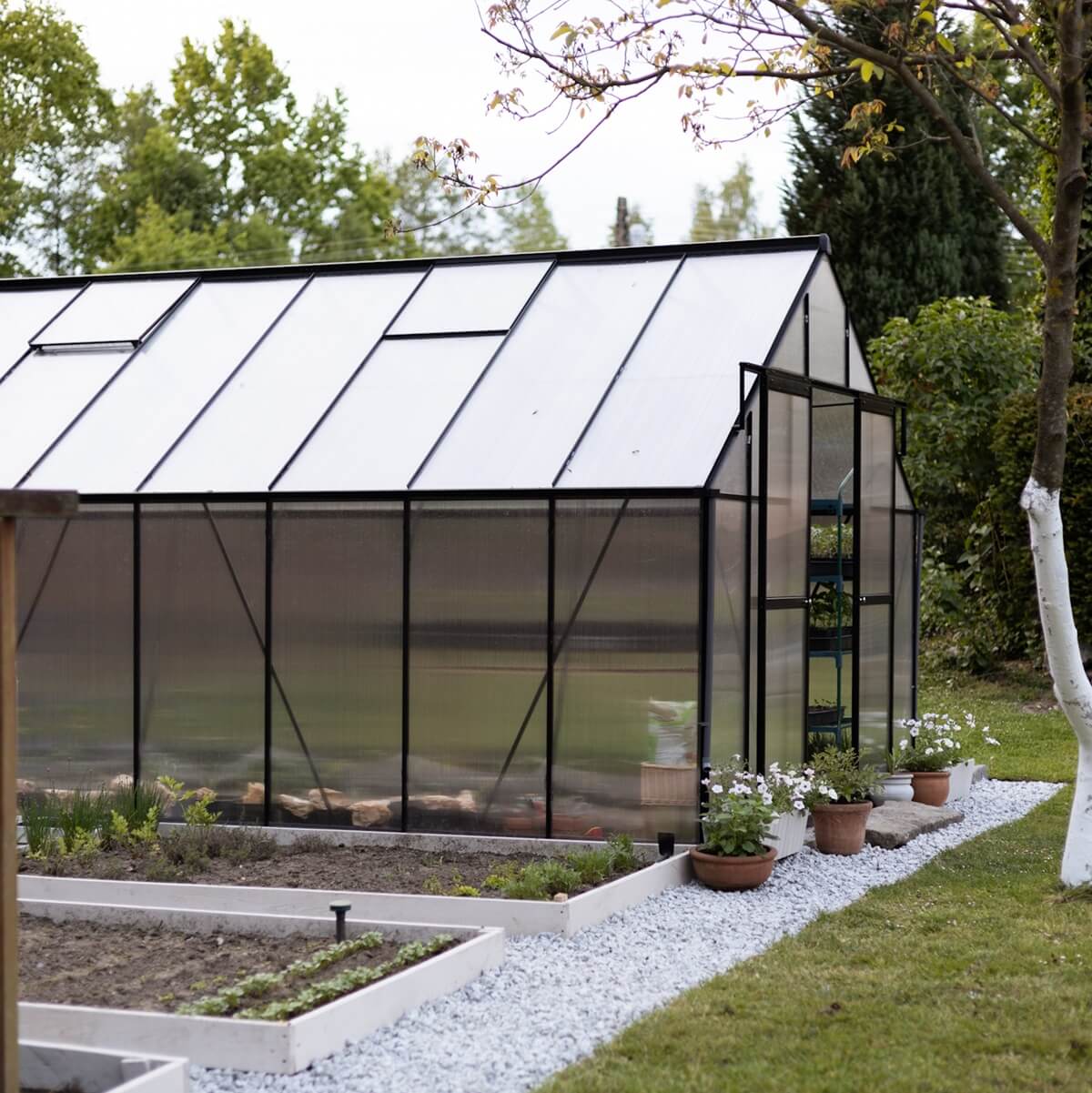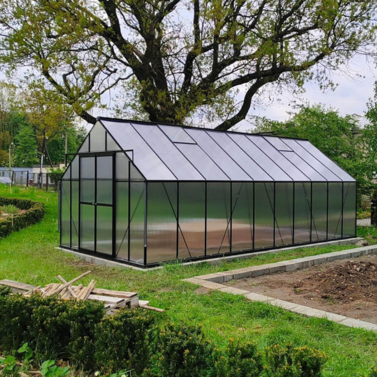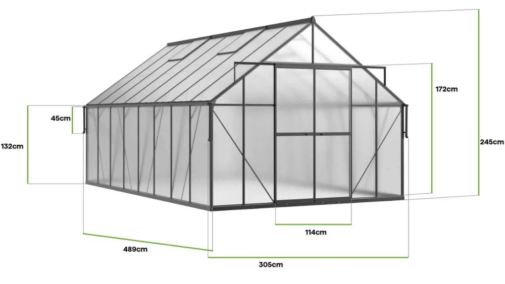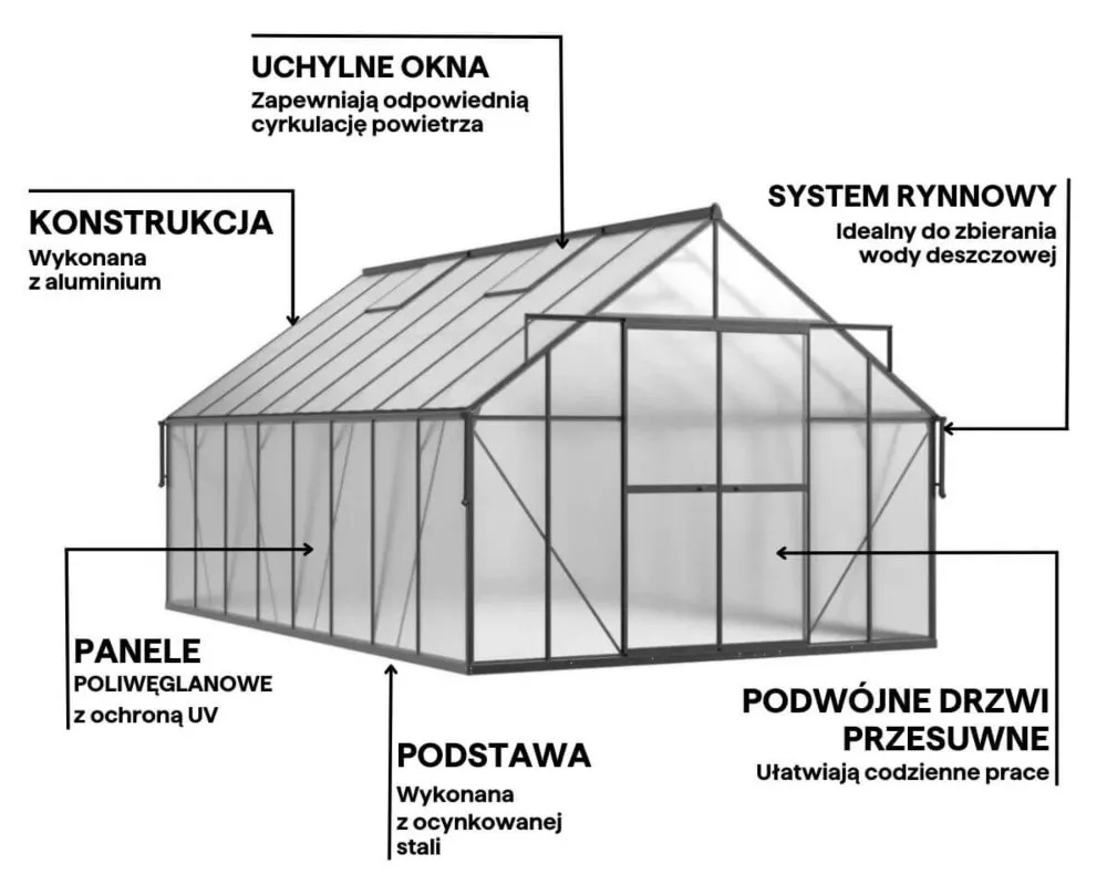 Oferujemy przestronną szklarnię ogrodową, która stanowi doskonałe rozwiązanie dla każdego, kto marzy o efektywnej uprawie roślin w komfortowych warunkach. Szklarnia poliwęglanowa Slide-In NEW 305x489cm Black – Cultivo to funkcjonalne rozwiązanie, które łączy trwałość, przestronność i estetykę. Wykonana z solidnej aluminiowej ramy oraz dwuściennych paneli poliwęglanowych 6 mm, zapewnia doskonałą ochronę przed szkodliwym promieniowaniem UV, jednocześnie pozwalając na optymalne oświetlenie wnętrza. Dzięki innowacyjnemu systemowi Slide-In, panele wsuwane są w ramy, co zapewnia ich większą stabilność i odporność na warunki atmosferyczne. Szklarnia ma imponujące wymiary: 489 cm długości, 305 cm szerokości i 245 cm wysokości, co daje obszerną przestrzeń do uprawy roślin. Konstrukcja szklarni została uzupełniona o dwie poprzeczki poziome, co podnosi wytrzymałość dachu na zalegający śnieg i wiatr. Cztery okna wentylacyjne umożliwiają efektywną cyrkulację powietrza, zapewniając odpowiednią wilgotność i zapobiegając przegrzewaniu się roślin. Przesuwne drzwi o wymiarach 172x114 cm ułatwiają dostęp do wnętrza, a wysokość ścian sprawia, że poruszanie się wewnątrz jest wygodne. Dodatkowym atutem jest rynna deszczowa o długości 45 cm, umożliwiająca zbieranie wody deszczowej, co sprzyja ekologicznemu nawadnianiu upraw. Ta szklarnia to doskonały wybór dla każdego ogrodnika, który ceni jakość i funkcjonalność. Idealna do całorocznej uprawy roślin!