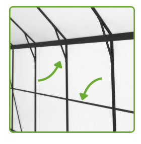Zaawansowany system Slide-In umożliwia montaż paneli poliwęglanowych bez użycia metalowych spinek, wsuwając je bezpośrednio w ramy konstrukcji, co zapewnia wysoką stabilność i trwałość szklarni. Dzięki temu nawet początkujący mogą szybko złożyć szklarnie. Panele są solidnie osadzone w ramie, co zwiększa odporność na wiatr i trudne warunki atmosferyczne, a brak luźnych elementów ogranicza ryzyko uszkodzeń w dłuższym czasie. Dokładny sposób działania systemu pokazano na filmie. Należy pamiętać, że szklarnia musi być ustawiona co najmniej 1,5 m od budynku, aby zapewnić prawidłową instalację i wentylację.