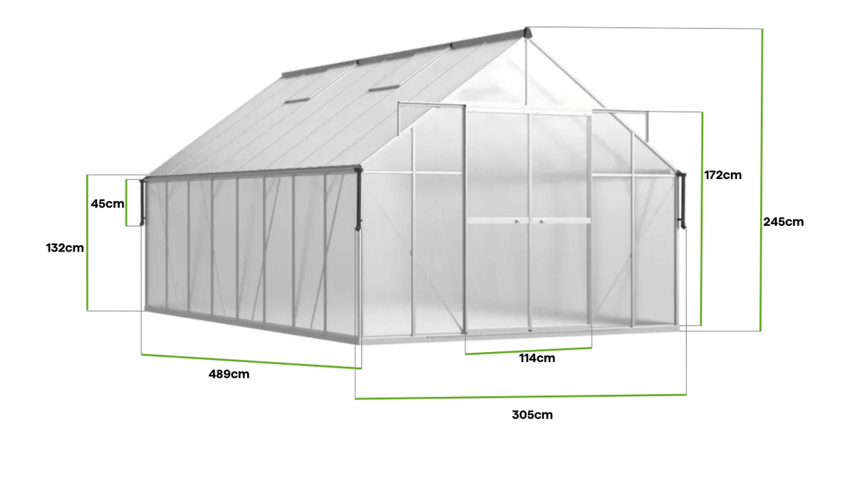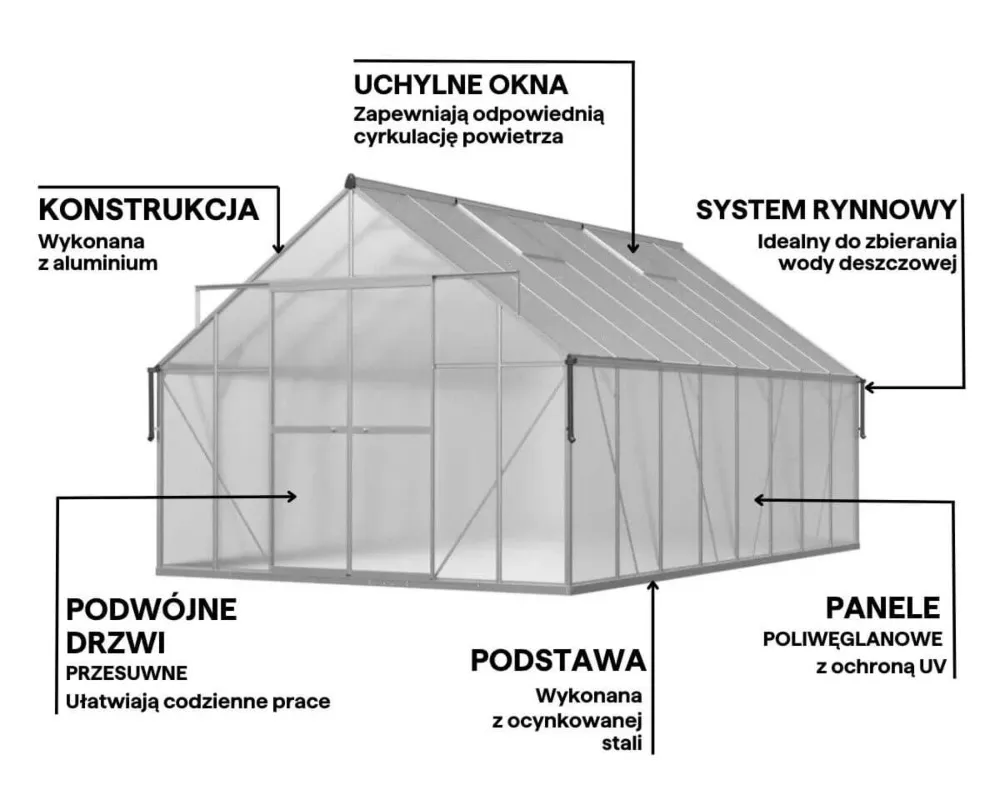 Zyskaj pełną kontrolę nad swoim ogrodem dzięki szklarni Cultivo w kolorze srebrnym. Wykonana z wysokiej jakości ramy aluminiowej o grubości 1,3 mm oraz paneli poliwęglanowych 6 mm z ochroną UV, ta szklarnia zapewnia trwałość i odporność na zmienne warunki pogodowe, chroniąc Twoje rośliny przed nadmiernym nasłonecznieniem i zimnem. Dzięki nowoczesnemu systemowi ,,Slide-In", montaż paneli jest szybki, prosty i stabilny, a cała konstrukcja zyskuje na wytrzymałości. Wymiary szklarni wynoszące 489 cm długości, 305 cm szerokości i 245 cm wysokości dają Ci ogromną przestronność, idealną do wzrostu różnych upraw. Przesuwne drzwi o wymiarze 172x114 cm i cztery okna wentylacyjne umożliwiają swobodny dostęp oraz skuteczną wentylację, co zapewnia zdrowy mikroklimat dla roślin. W szklarni dodano dwie poziome poprzeczki, które usztywniają konstrukcję dachu, zwiększając odporność na śnieg i podmuchy wiatru. Dodatkowo, rynna deszczowa o długości 45 cm pozwala na zbieranie deszczówki, dając Ci możliwość ekologicznego i oszczędnego nawadniania upraw. Szklarnia ogrodowa z poliwęglanu Slide-In NEW 305x489cm Silver - Cultivo to konstrukcja, która zadba o Twoje rośliny. Jest to doskonała inwestycja dla każdego ogrodnika, który szuka niezawodnej i przestronnej szklarni do efektywnej uprawy przez cały rok.