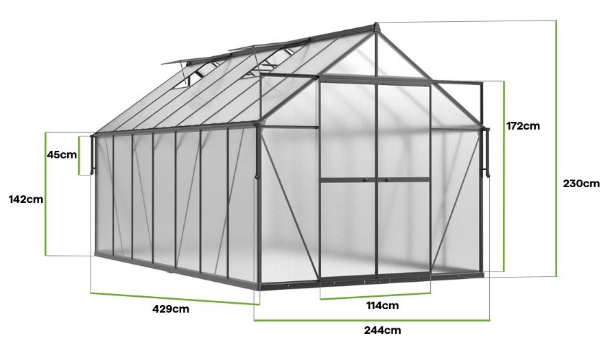 Szklarnia poliwęglanowa Slide-In NEW 244x429cm Black marki Cultivo o wzmocnionej konstrukcji to doskonałe rozwiązanie dla ogrodników, którzy poszukują przestrzeni i trwałości. Czarny kolor konstrukcji dodaje szklarni wyjątkowego charakteru, czyniąc ją nie tylko funkcjonalnym, ale również estetycznym elementem ogrodu. Dzięki długości 429 cm i szerokości 244 cm, oferuje dużą przestrzeń do uprawy szerokiej gamy roślin, od warzyw i owoców po kwiaty i zioła. Wykonana z dwuściennych paneli poliwęglanowych o grubości 4 mm z ochroną UV, szklarnia zapewnia optymalne warunki wzrostu roślin, chroniąc je przed szkodliwymi promieniami słonecznymi i utrzymując stabilny mikroklimat. Solidna konstrukcja opiera się na aluminiowej ramie i ocynkowanej stalowej podstawie, które gwarantują odporność na korozję oraz długowieczność. Innowacyjny system Slide-In sprawia, że montaż jest szybki i prosty, eliminując problemy związane z tradycyjnymi metodami składania. Przesuwne podwójne drzwi o wymiarach 172x114 cm ułatwiają dostęp, a cztery okna wentylacyjne wspierają odpowiednią cyrkulację powietrza. Dwie poziome poprzeczki wzmacniają dach szklarni, zwiększając jej odporność na ciężar śniegu i działanie wiatru. Dodatkowo szklarnia wyposażona jest w praktyczną rynnę deszczową, umieszczoną na wysokości 97 cm, która umożliwia ekologiczne zbieranie deszczówki – idealne rozwiązanie wspierające zrównoważony rozwój ogrodu.