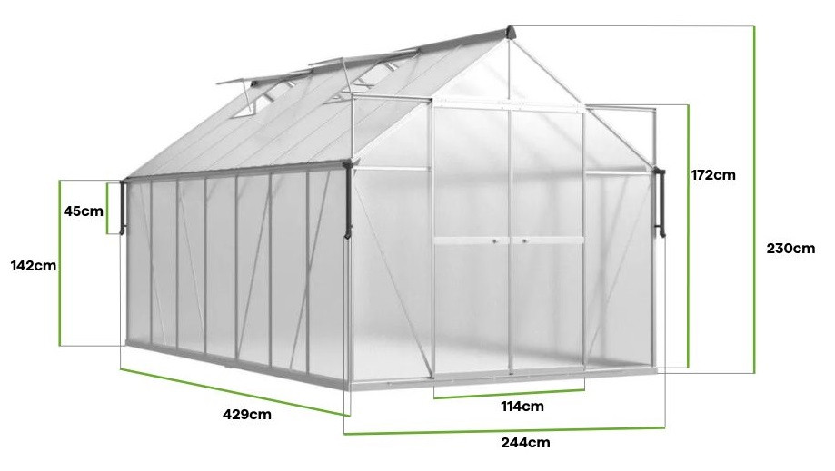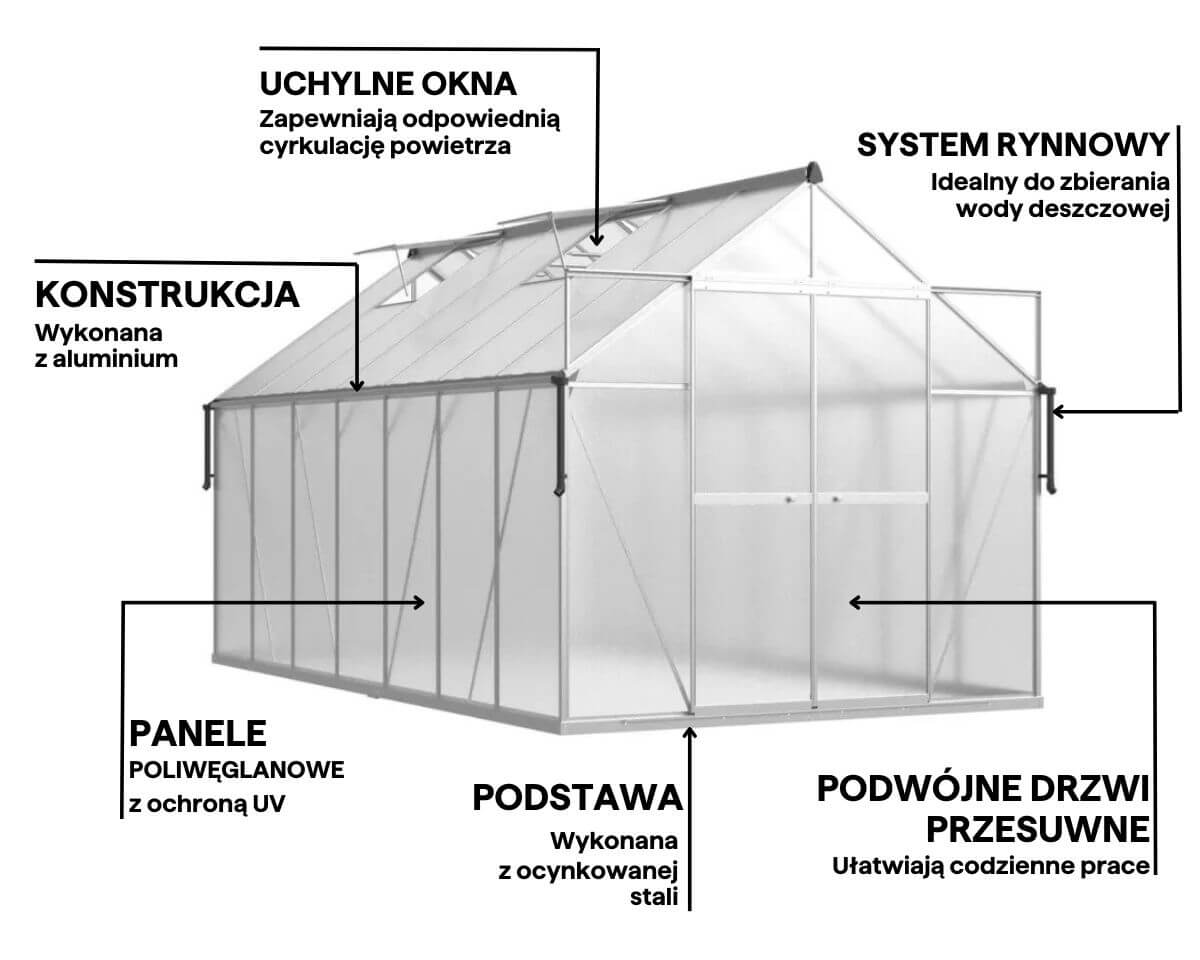 Szklarnia poliwęglanowa Slide-In NEW 244x429cm Silver marki Cultivo o wzmocnionej konstrukcji to propozycja dla osób, które poszukują przestronnego i trwałego rozwiązania do swojego ogrodu. Srebrny kolor konstrukcji nadaje jej nowoczesny, uniwersalny charakter, idealnie pasujący zarówno do minimalistycznych, jak i tradycyjnych aranżacji ogrodowych. Dzięki dużym wymiarom – długości 429 cm i szerokości 244 cm – szklarnia zapewnia obszerną przestrzeń do różnorodnych upraw, od soczystych warzyw po dekoracyjne kwiaty. Zastosowane panele poliwęglanowe o grubości 4 mm z filtrem UV skutecznie chronią rośliny przed zmiennymi warunkami atmosferycznymi, jednocześnie pozwalając na równomierne rozpraszanie światła. Solidna konstrukcja opiera się na aluminiowej ramie i ocynkowanej stalowej podstawie, co gwarantuje wyjątkową wytrzymałość na lata. Dzięki systemowi montażu Slide-In, instalacja paneli staje się szybka i wygodna, eliminując potrzebę stosowania skomplikowanych narzędzi czy klipsów. W szklarni dodano dwie poziome poprzeczki, które wzmacniają dach, podnosząc odporność konstrukcji na obciążenia śniegiem i działanie wiatru. Dla jeszcze większego komfortu użytkowania, szklarnia wyposażona jest w podwójne przesuwne drzwi o wymiarach 172x114 cm, które zapewniają łatwy dostęp, oraz cztery okna wentylacyjne wspierające cyrkulację powietrza. Dodatkowym atutem jest rynna deszczowa, umieszczona na wysokości 97 cm, która umożliwia zbieranie deszczówki do ekologicznego podlewania roślin.