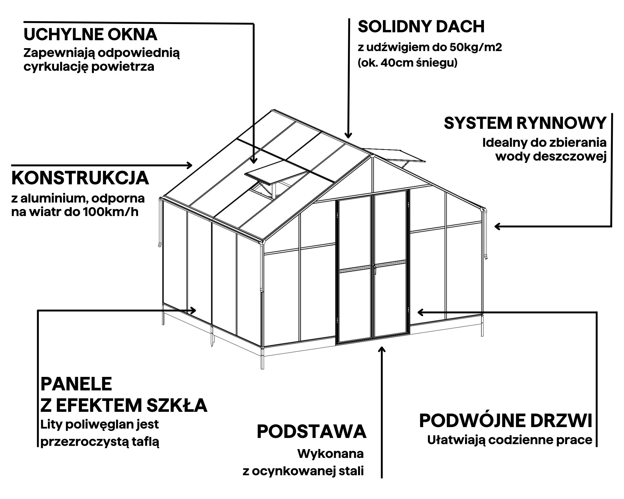 - Niezawodna wytrzymałość w trudnych warunkach – odporność na podmuchy wiatru do 100 km/h oraz obciążenie śniegiem do 50 kg/m² (około 40 cm warstwy śniegu).