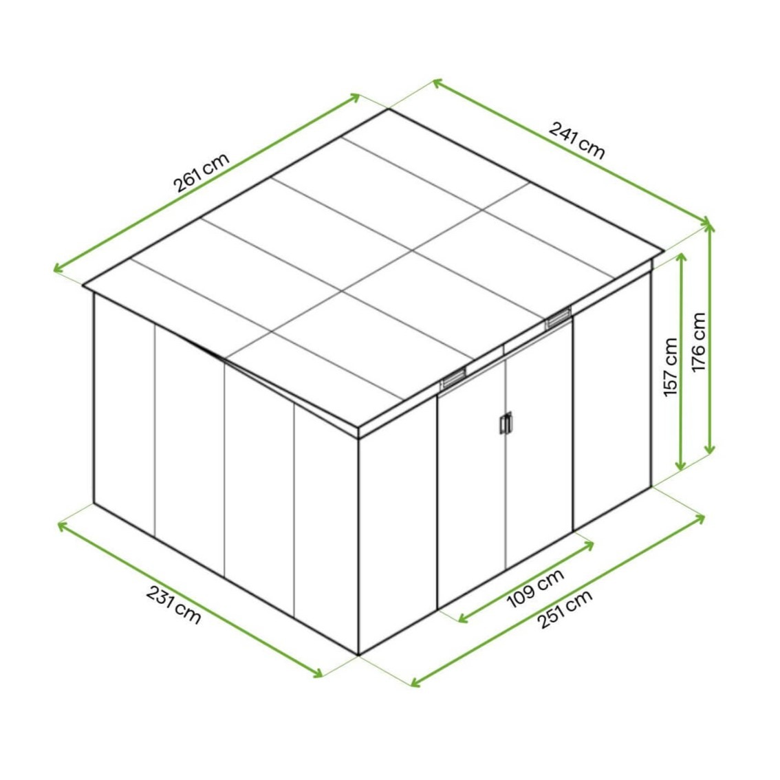 Domek OREGON od Hardmaister to stylowe rozwiązanie do przechowywania narzędzi ogrodowych. Konstrukcja o wymiarach 261x241 cm wykonana została z ocynkowanej stali, która jest odporna na promieniowanie UV i trudne warunki atmosferyczne. Spadzisty dach zapobiega gromadzeniu się wody, a do pielęgnacji wystarczy mycie wodą.