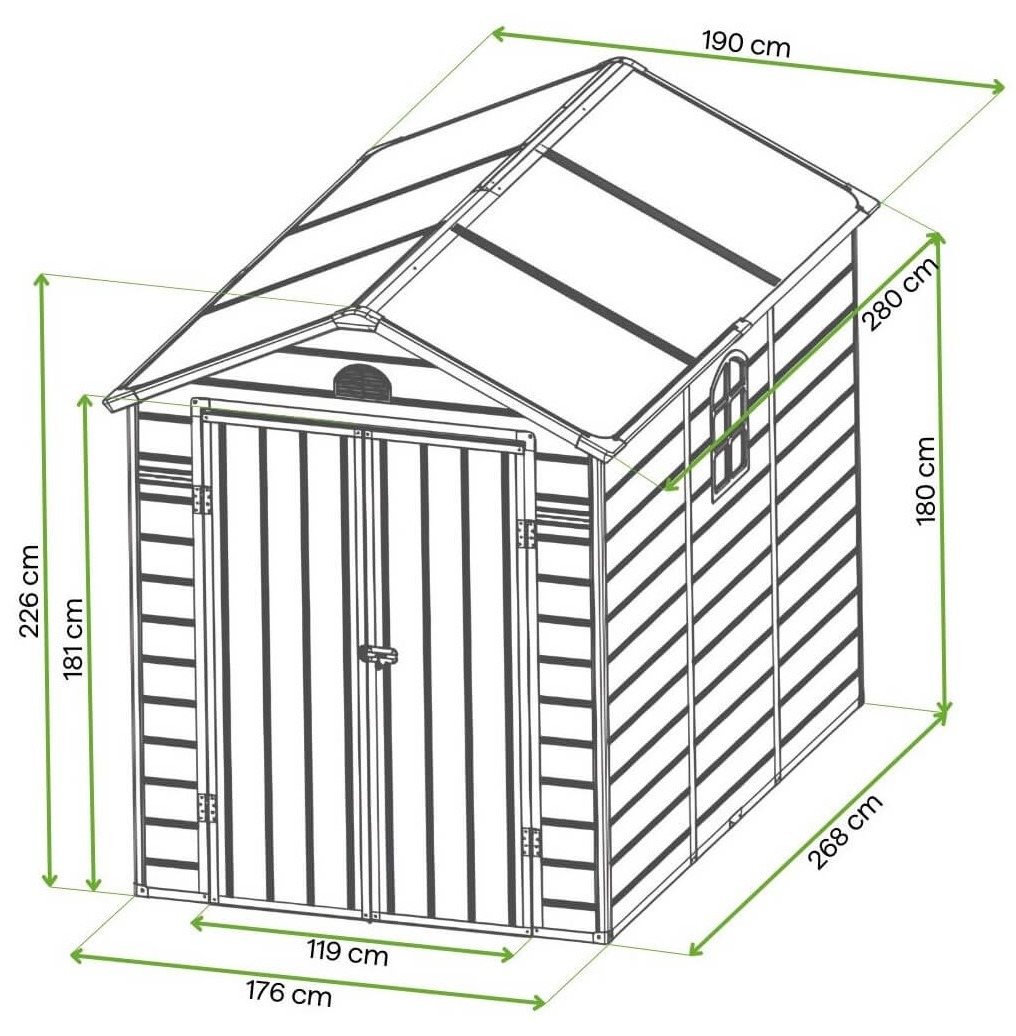 Domek VERMONT łączy styl i funkcjonalność, oferując wygodne miejsce do przechowywania narzędzi, sprzętu ogrodowego i akcesoriów. Jego uniwersalny design pasuje do każdego ogrodu. Dwuspadowy dach skutecznie odprowadza wodę i śnieg, a pielęgnacja jest prosta – wystarczy wilgotna gąbka.