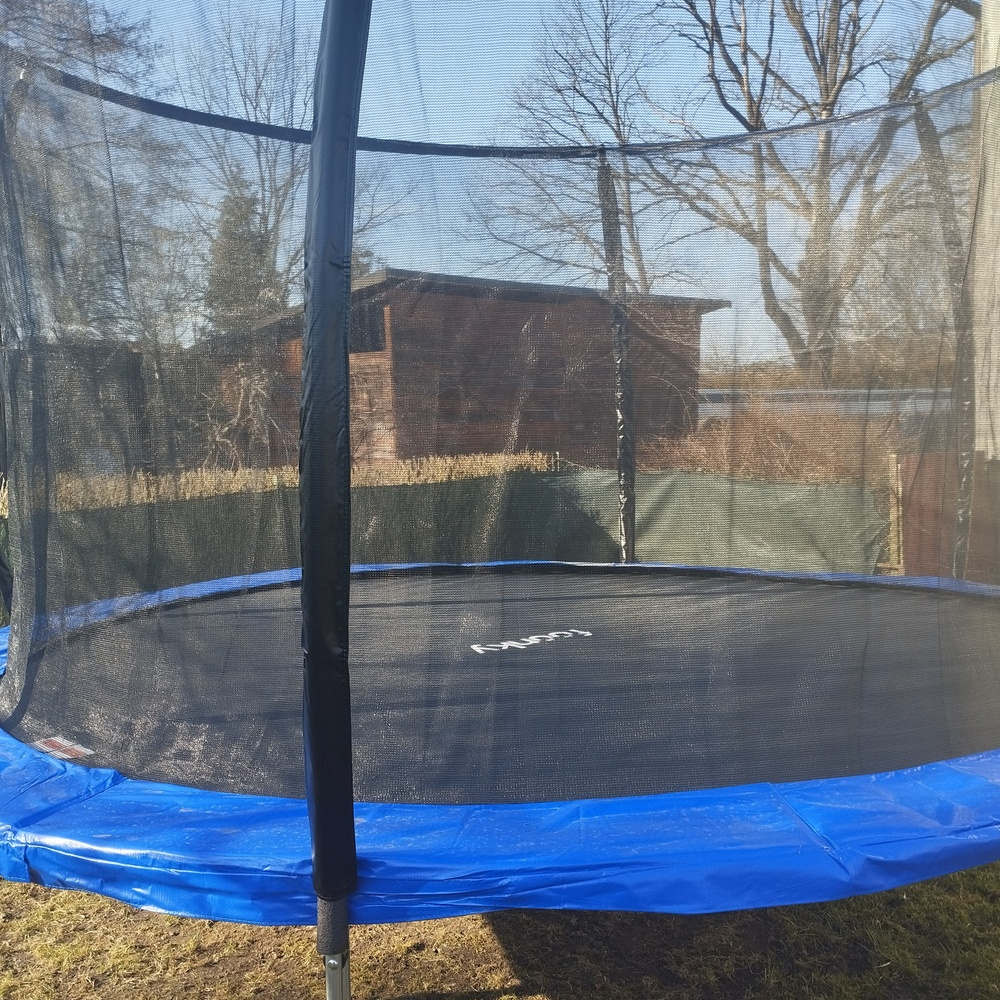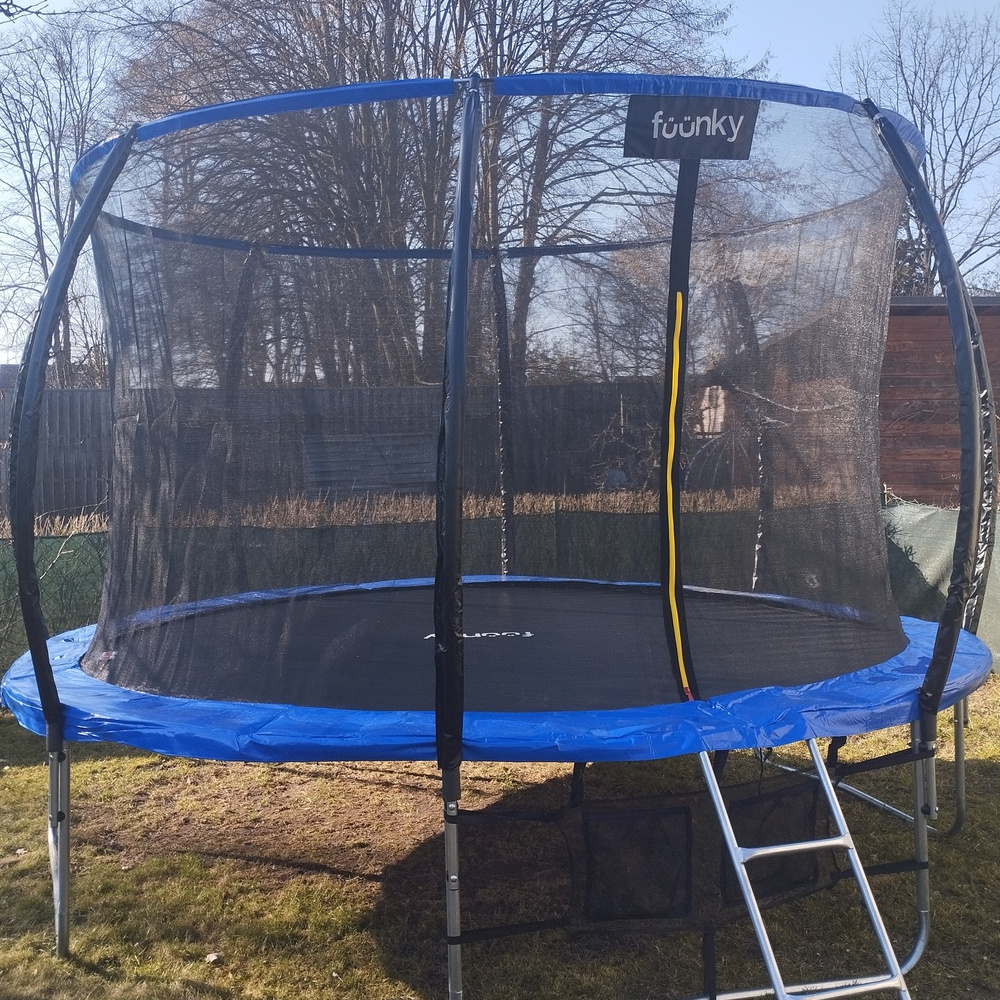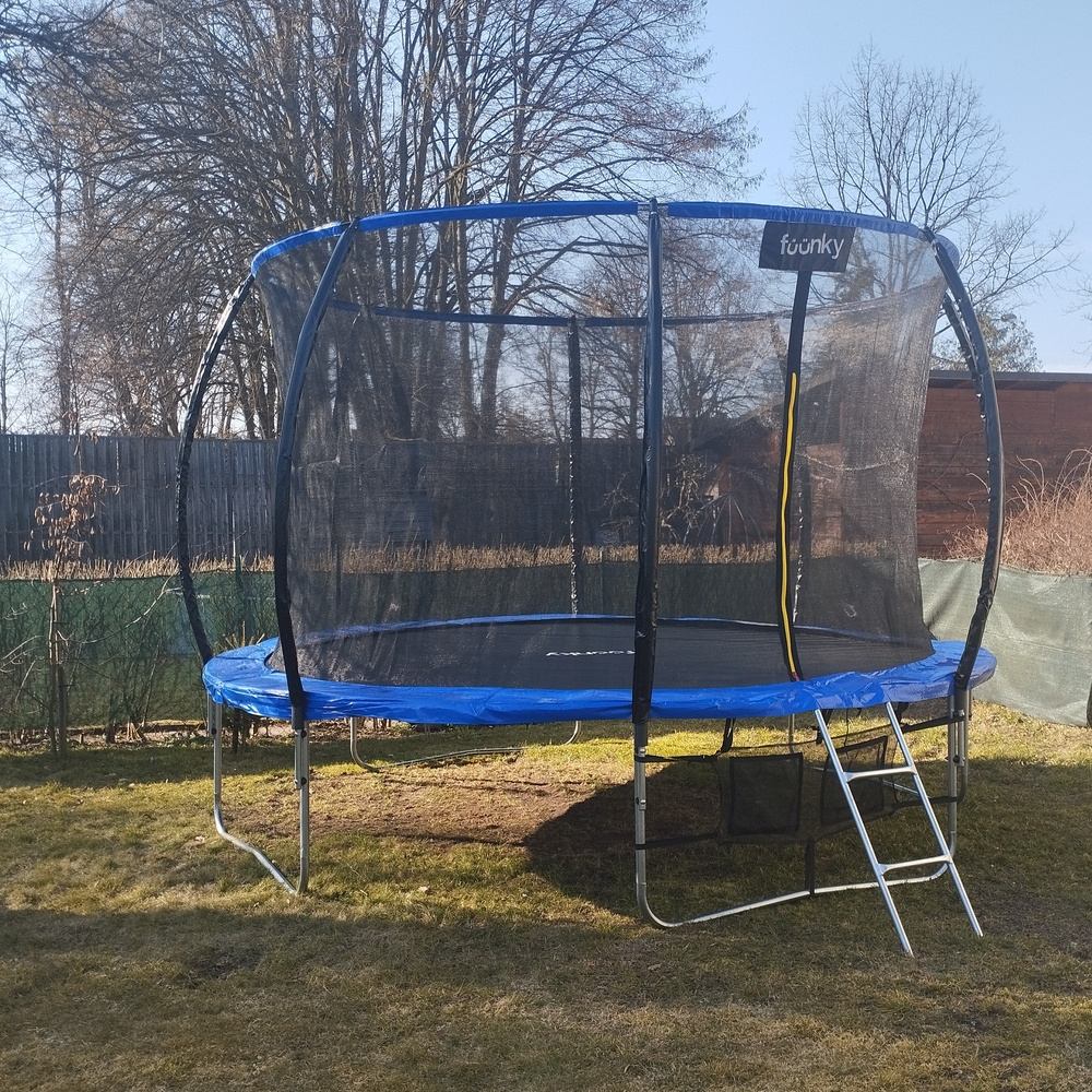 Potrzebujesz inspiracji? Oto kilka przykładowych realizacji trampoliny ogrodowej 12FT 366cm + drabinka + siatka na obuwie, niebieska - Fuunky u naszych klientów. Nie czekaj! Tak może wyglądać Twój ogród!