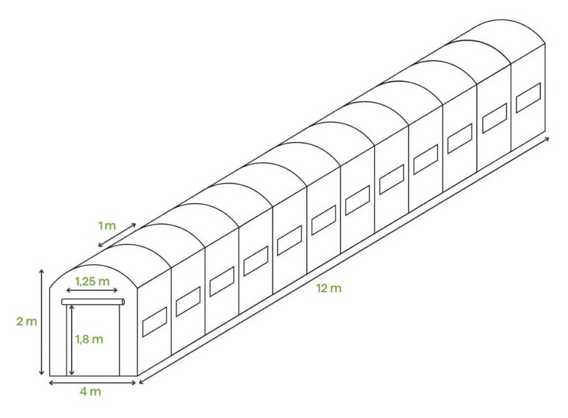 Tunel Foliowy PODWÓJNE Drzwi 4x12x2 - 48m2 12 sekcji Zielony
