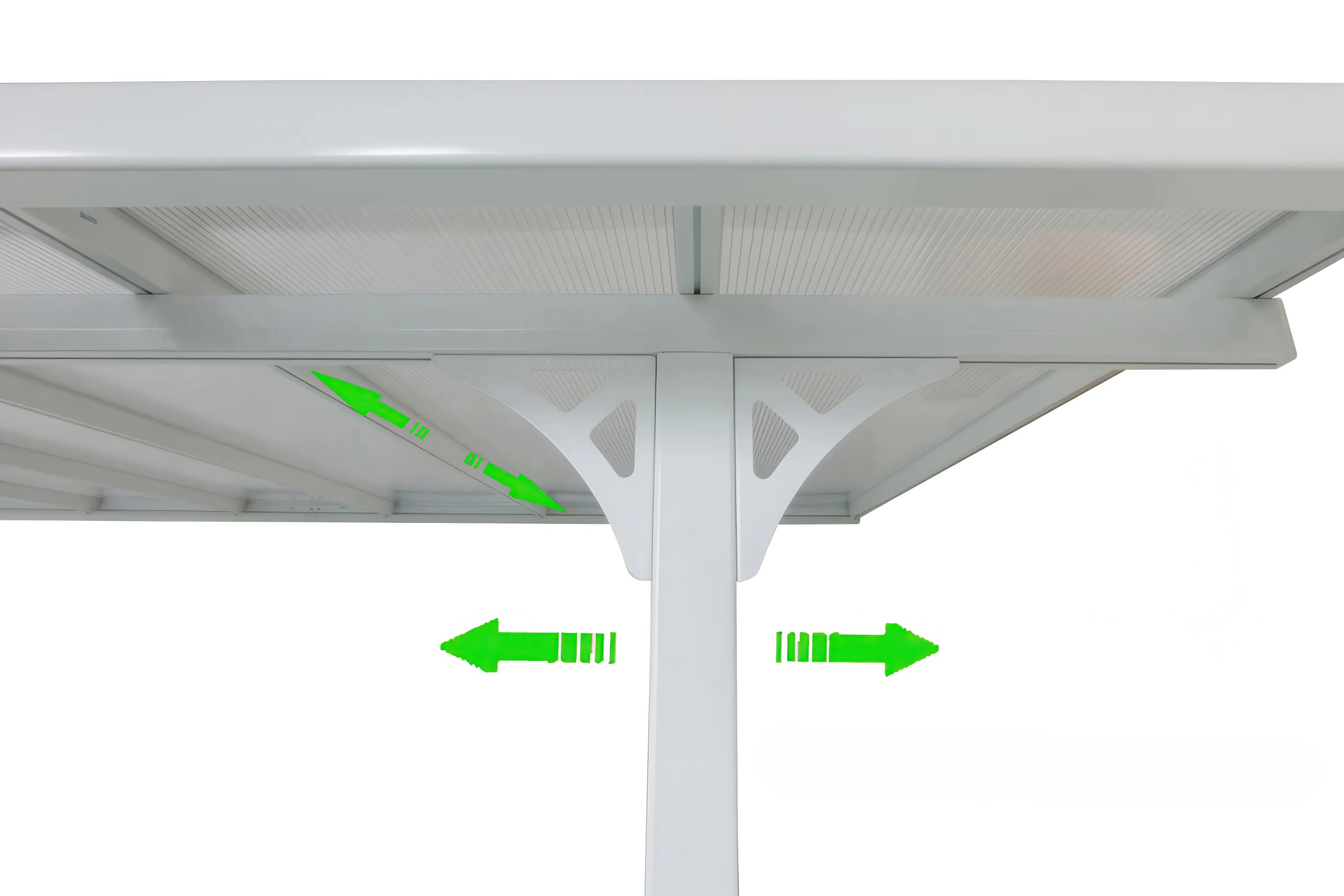 Regulowane słupy nośne umożliwiają swobodne przesuwanie ich po specjalnych rowkach w belkach górnych, co pozwala precyzyjnie dostosować ich rozmieszczenie do układu tarasu lub dostępnej przestrzeni.
