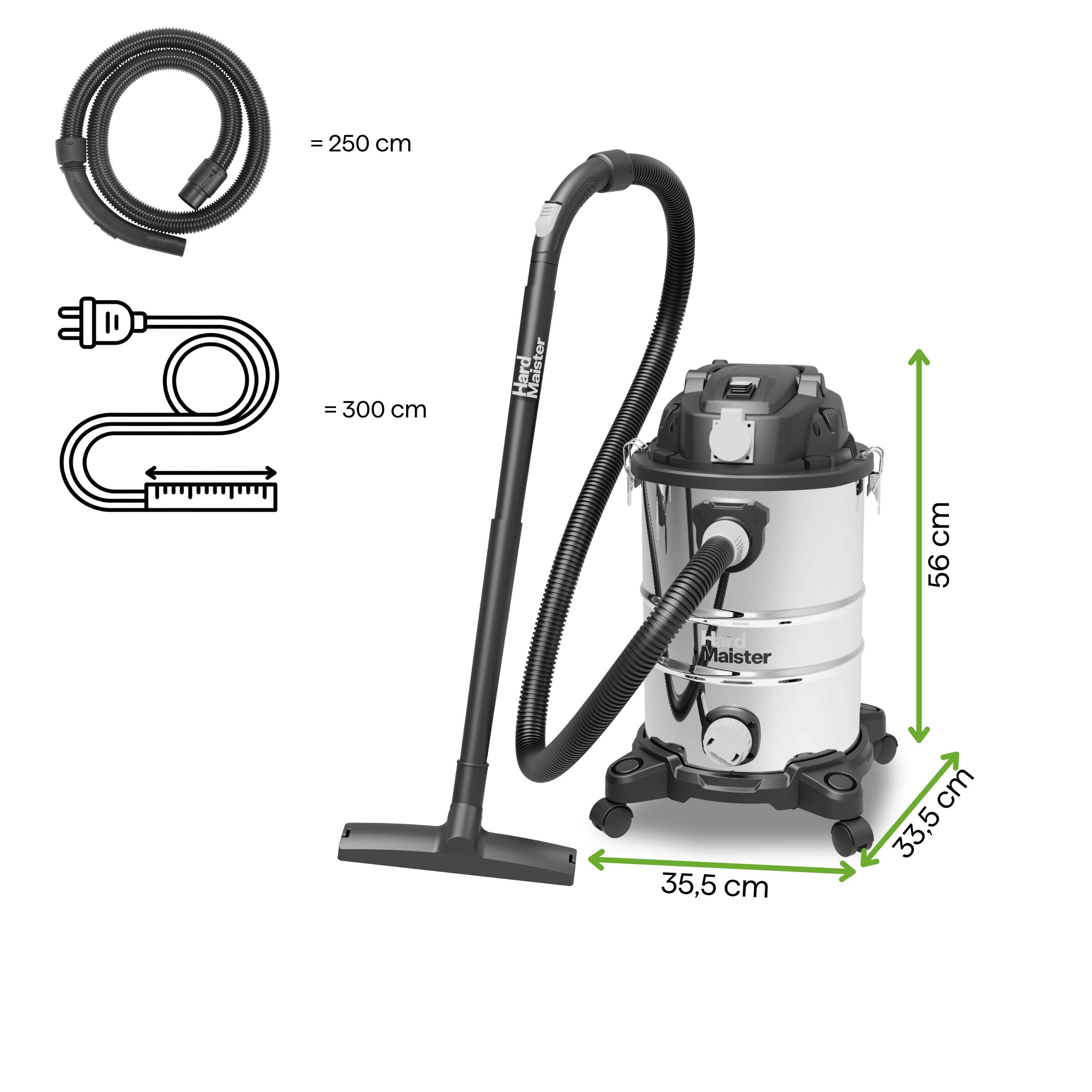 Wydajny odkurzacz warsztatowy o mocy 1300 W do pracy na sucho i mokro marki HardMaister to profesjonalne rozwiązanie stworzone do intensywnych prac porządkowych. Wytrzymały zbiornik ze stali nierdzewnej o pojemności 25 L gwarantuje odporność na trudne warunki budowlane i warsztatowe. System oczyszczania filtra HEPA oraz imponująca siła ssania 19 kPa pozwalają błyskawicznie usunąć pył, gruz oraz rozlane ciecze. Funkcja wydmuchu i mobilna konstrukcja na czterech kółkach czynią sprzątanie garażu czy piwnicy niezwykle efektywnym.