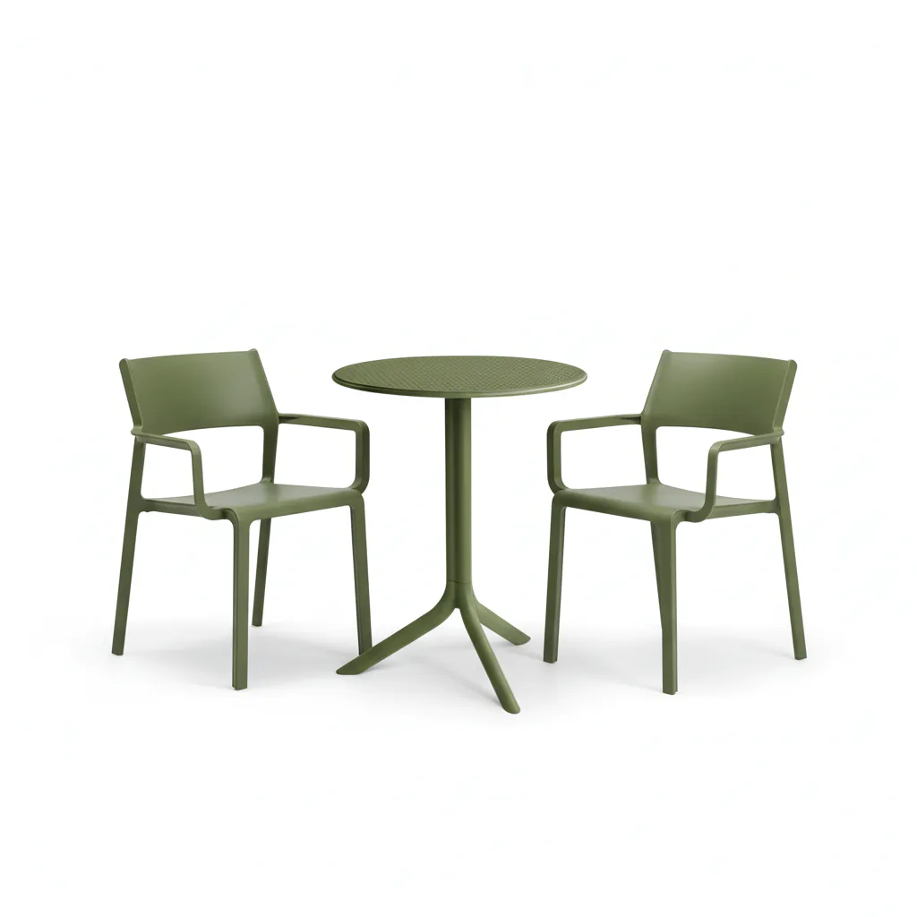 Prezentujemy nowoczesny zestaw balkonowy TRILL/STEP 2+1 AGAVE marki Nardi , charakteryzujący się bardzo-szerokim zastosowaniem. Ten kompaktowy komplet został zaprojektowany z myślą o hotelach i restauracjach (HoReCa), ale doskonale sprawdza się również jako stylowy zestaw mebli balkonowych w przestrzeniach prywatnych. Na zestaw Nardi TRILL/STEP 2+1 składają się dwa wygodne krzesła TRILL oraz funkcjonalny stolik STEP. Jeśli chodzi o design, włoskie meble Nardi prezentują bardzo modny minimalizm, a w kwestii jakości i żywotności należą do najwyższej klasy, zapewniając niezrównany komfort użytkowania. Zastosowane materiały są wyjątkowo wytrzymałe i odporne na pogodę, gwarantując długą żywotność, a zestaw jest banalnie prosty w utrzymaniu w perfekcyjnej formie i nie wymaga specjalistycznej konserwacji. Kluczową zaletą jest to, że stolik STEP posiada możliwość ustawienia w dwóch wariantach wysokości (niski lub wysoki), co zwiększa jego uniwersalność (stolik zarówno kawowy, jak i jadalny). Wybierz włoską jakość Nardi i ciesz się zestawem, który łączy styl, komfort i wytrzymałość!