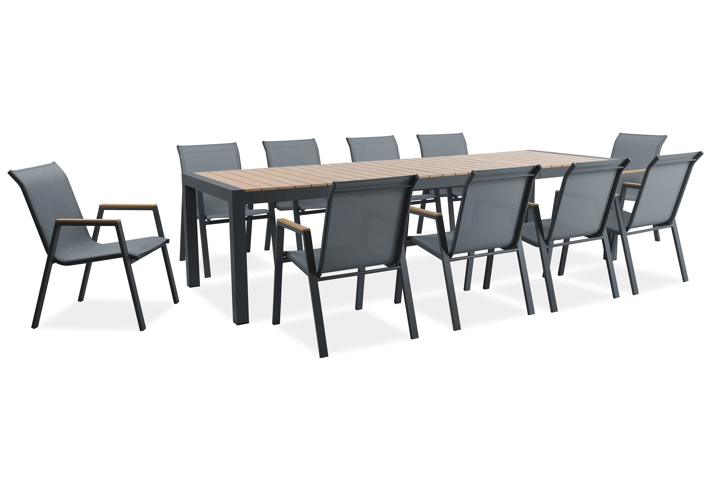Zestaw jadalniany MALAWI 10+1 Dark Grey marki Bjørkka to synonim gościnności w ekskluzywnym wydaniu. Monumentalny, rozkładany stół z blatem Heat Transfer Polywood o grubości 14 mm zachwyca estetyką naturalnego usłojenia drewna, oferując przy tym niewrażliwość na wilgoć . Aluminiowa, lekka rama w eleganckim kolorze gwarantuje wieloletnią trwałość bez korozji. Dziesięć krzeseł z tkaniną Textiline zapewnia wyjątkowy komfort, czyniąc to rozwiązanie bezkonkurencyjnym dla dużych tarasów i ogrodów.