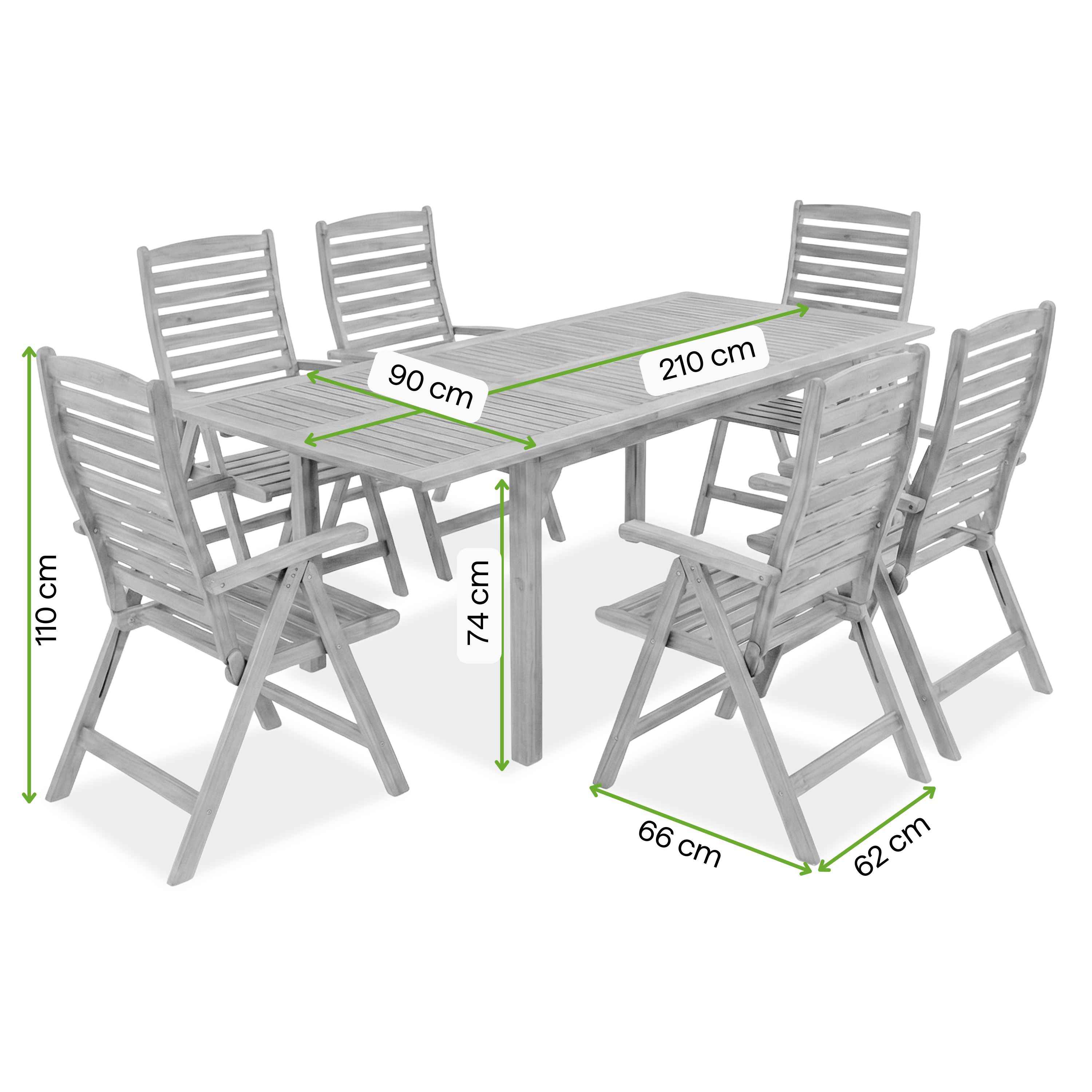 Zestaw jadalniany z drewna akacjowego na taras AKADIA 210/6 + 1 - Bjørkka składający się z 6 składanych krzeseł z regulowanym oparciem oraz solidnego stołu drewnianego to praktyczne i estetyczne rozwiązanie do ogrodu, na taras lub patio. Konstrukcja z drewna akacjowego łączy trwałość z naturalnym wyglądem, a funkcjonalne rozwiązania zapewniają komfort codziennego użytkowania. Idealny wybór do wspólnych posiłków i spotkań na świeżym powietrzu.
