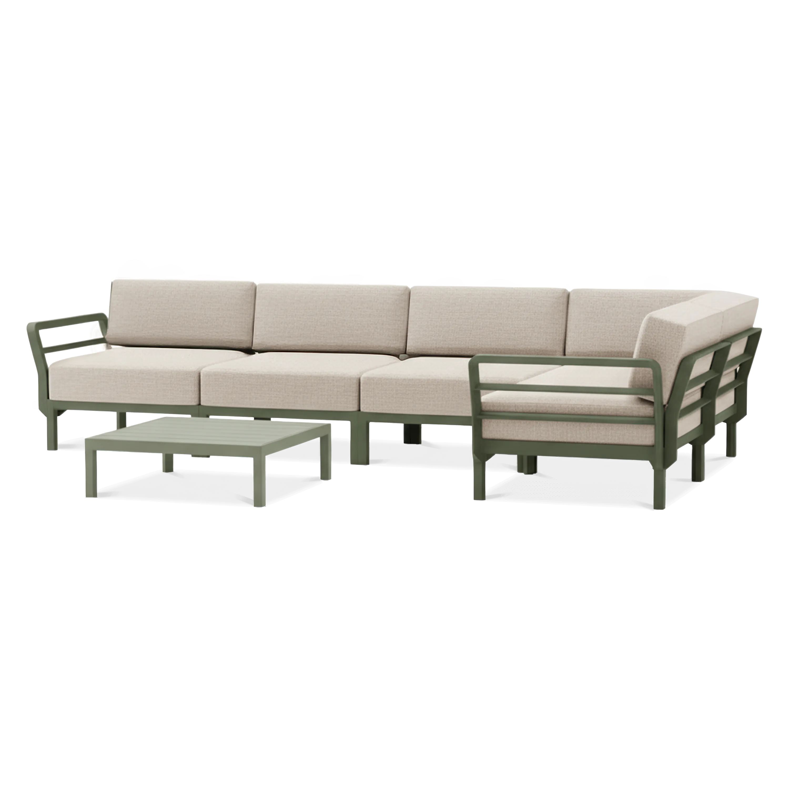 Zestaw mebli do ogrodu MAXIMO 5 Cactus-Perla marki Nardi to eleganckie rozwiązanie dla osób, które chcą stworzyć wyjątkową przestrzeń wypoczynkową w swoim ogrodzie. Sofa modułowa składa się z pięciu siedzisk i ośmiu oparć, co pozwala na elastyczne aranżowanie układu mebli według potrzeb. Rama z regenerowanej żywicy polipropylenowej z włókna szklanego i dodatkiem UV jest trwała, odporna na promieniowanie UV i zmienne warunki pogodowe. Poduszki Sunbrella zapewniają wygodę i są łatwe do utrzymania w czystości dzięki zdejmowanym pokrowcom. Całość uzupełnia stolik MAXIMO w kolorze Cactus, który jest praktyczny i doskonale pasuje do narożnika. Subtelna kolorystyka Cactus-Perla nadaje zestawowi świeżości i lekkości, dzięki czemu świetnie komponuje się z zielenią ogrodu i nowoczesnymi aranżacjami tarasowymi. Zestaw mebli do ogrodu MAXIMO 5 Cactus-Perla od Nardi spełni oczekiwania nawet najbardziej wymagających użytkowników.