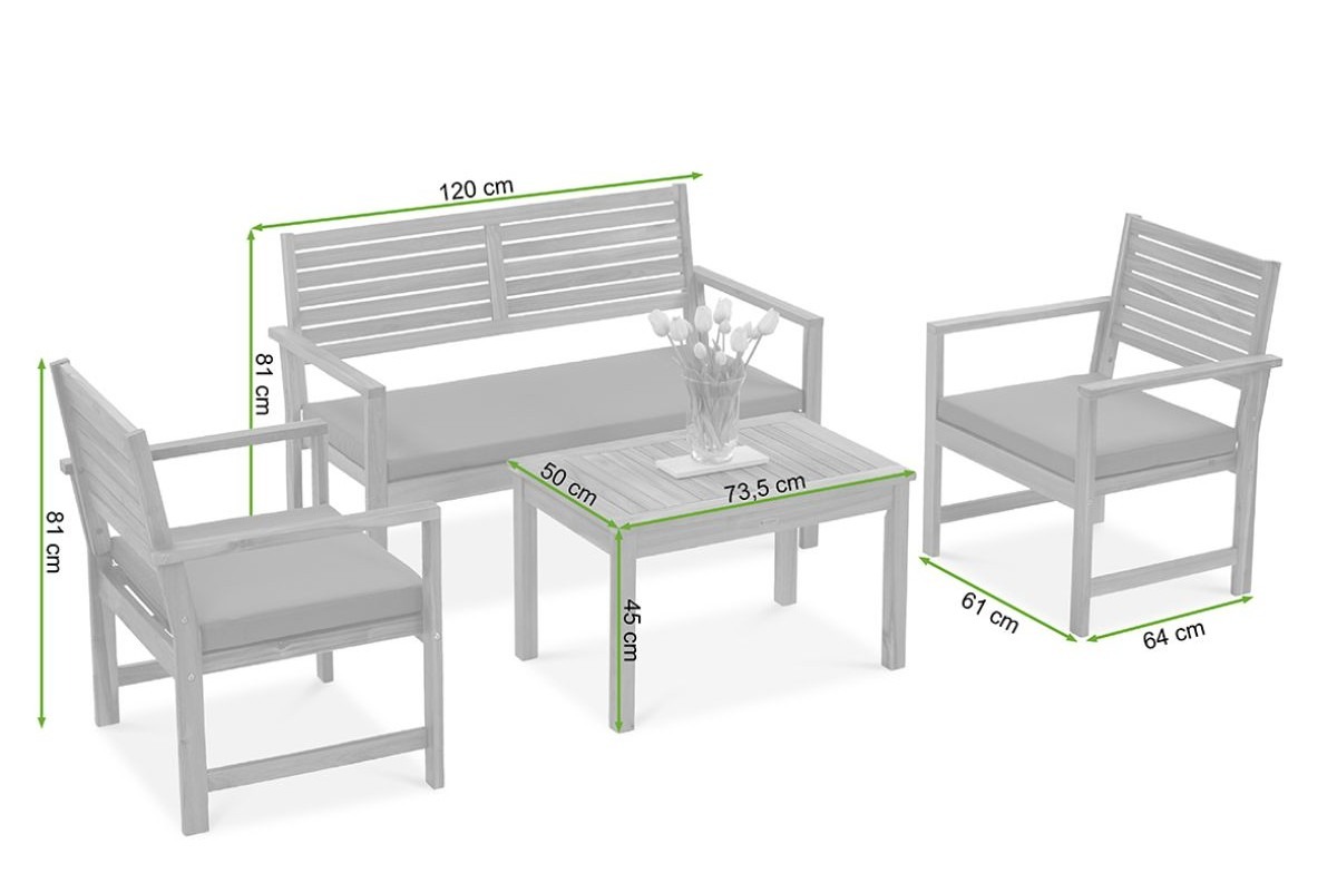 Zestaw mebli ogrodowych OTTO CAFFE to eleganckie i praktyczne rozwiązanie do każdej przestrzeni wypoczynkowej na świeżym powietrzu. Składający się z sofy, dwóch foteli i stolika kawowego komplet wykonano z trwałego drewna akacjowego o teakowym wykończeniu. Komfort użytkowania zapewniają grube, wodoodporne poduszki, a kompaktowe wymiary sprawiają, że zestaw sprawdzi się zarówno w ogrodzie, jak i na tarasie czy balkonie.